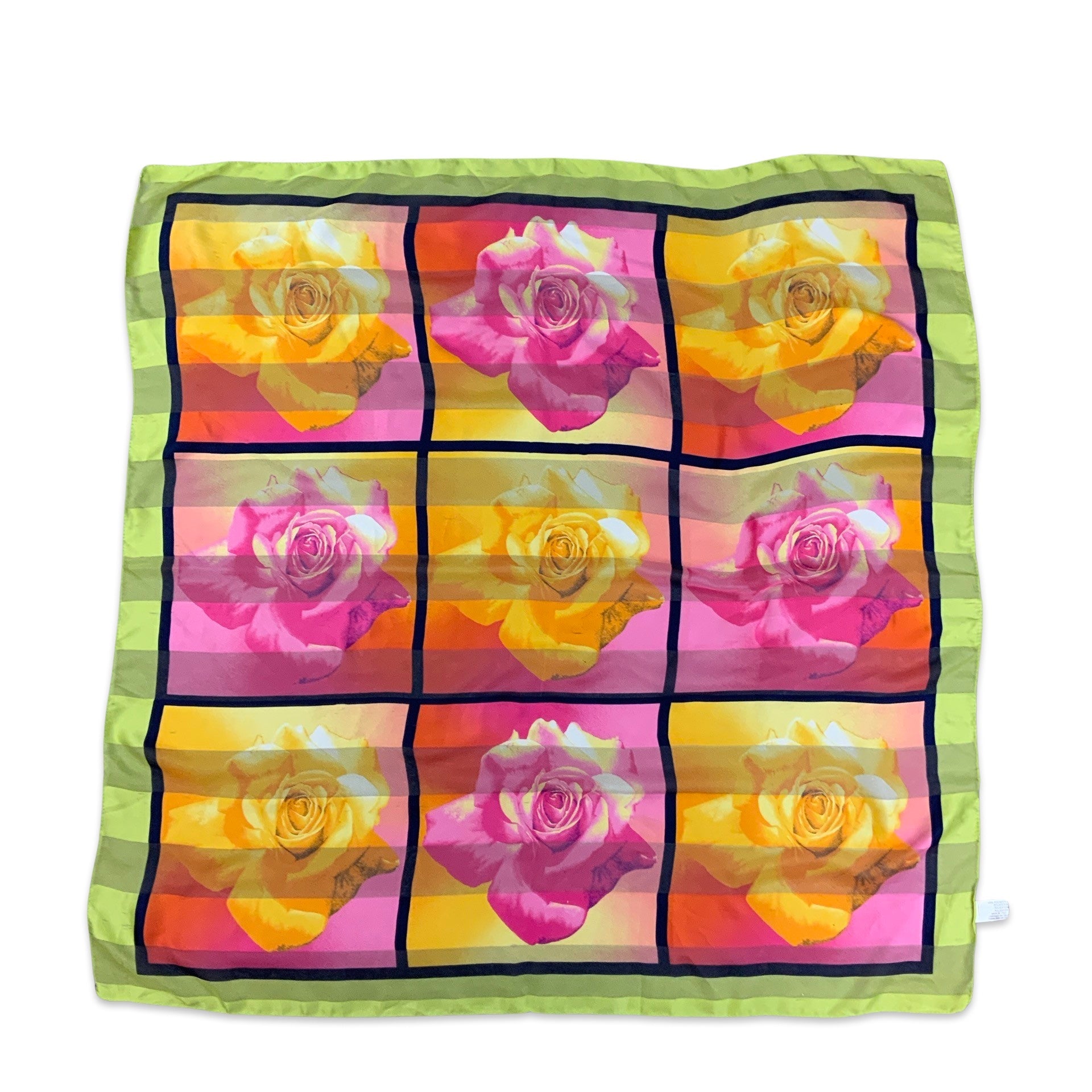 Vintage Y2K graphic rose print design scarf. Sheer, large, lightweight, polyester. Multicoloured in lime green, bright pink, orange and navy blue.
