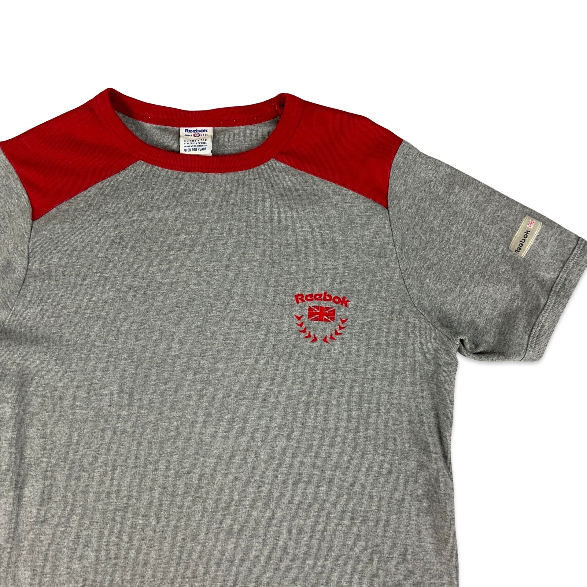 Vintage Y2K Reebok men's fitted ringer tee in red and grey with contrast shoulders and small logo print on chest.