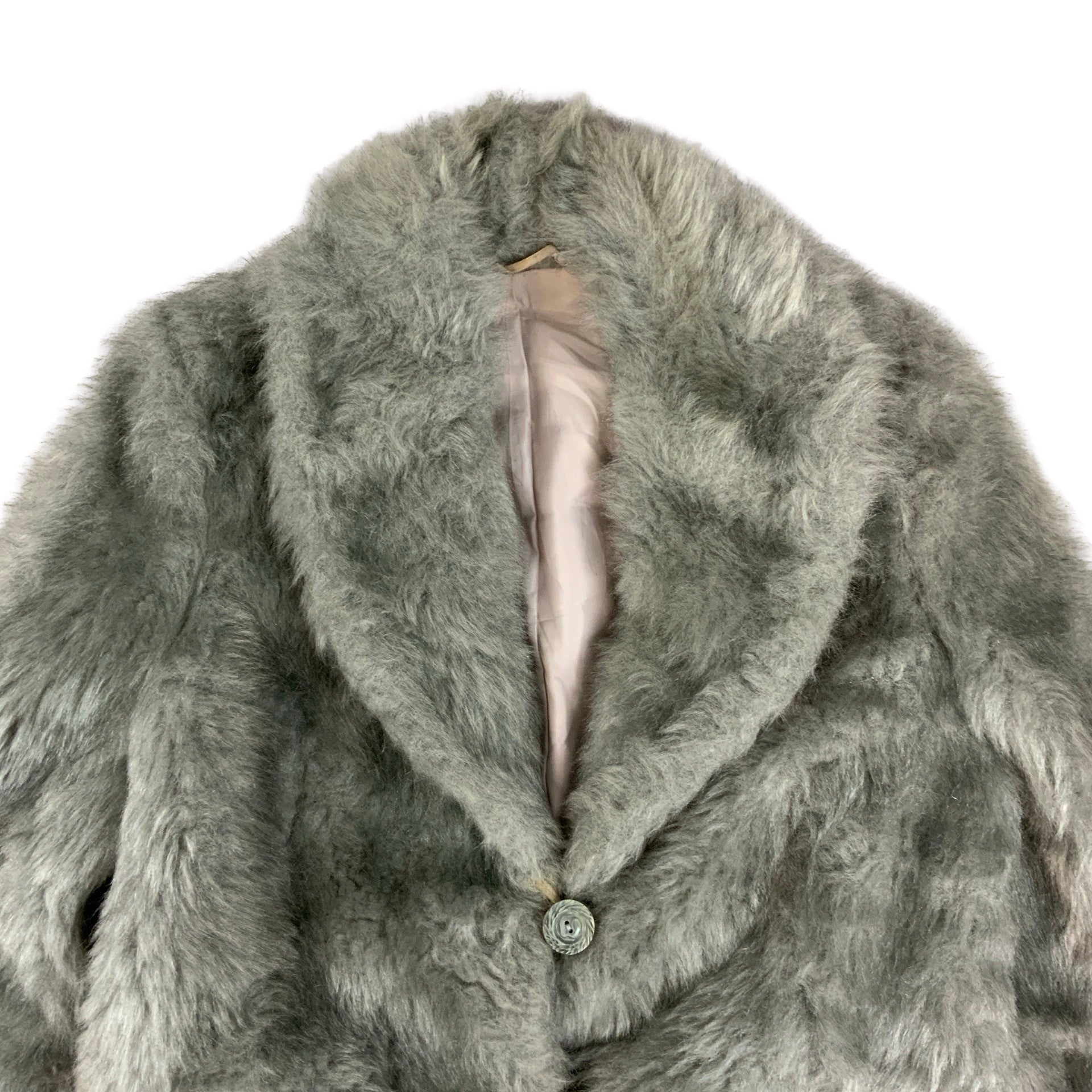 Vintage Y2K faux fur jacket in light and dark greys. Shawl collar, marble effect button fastening. Pockets, fully lined in grey pink.
