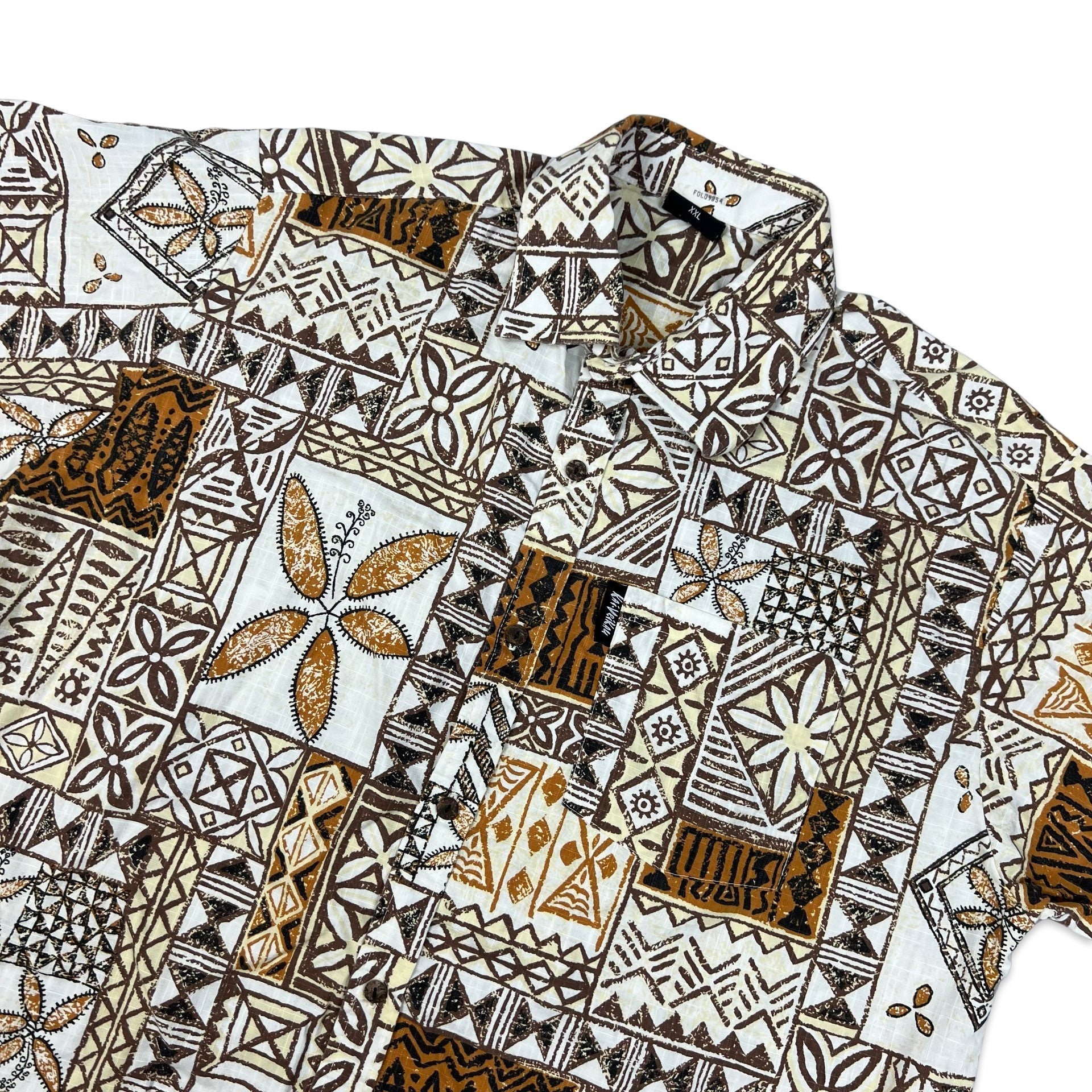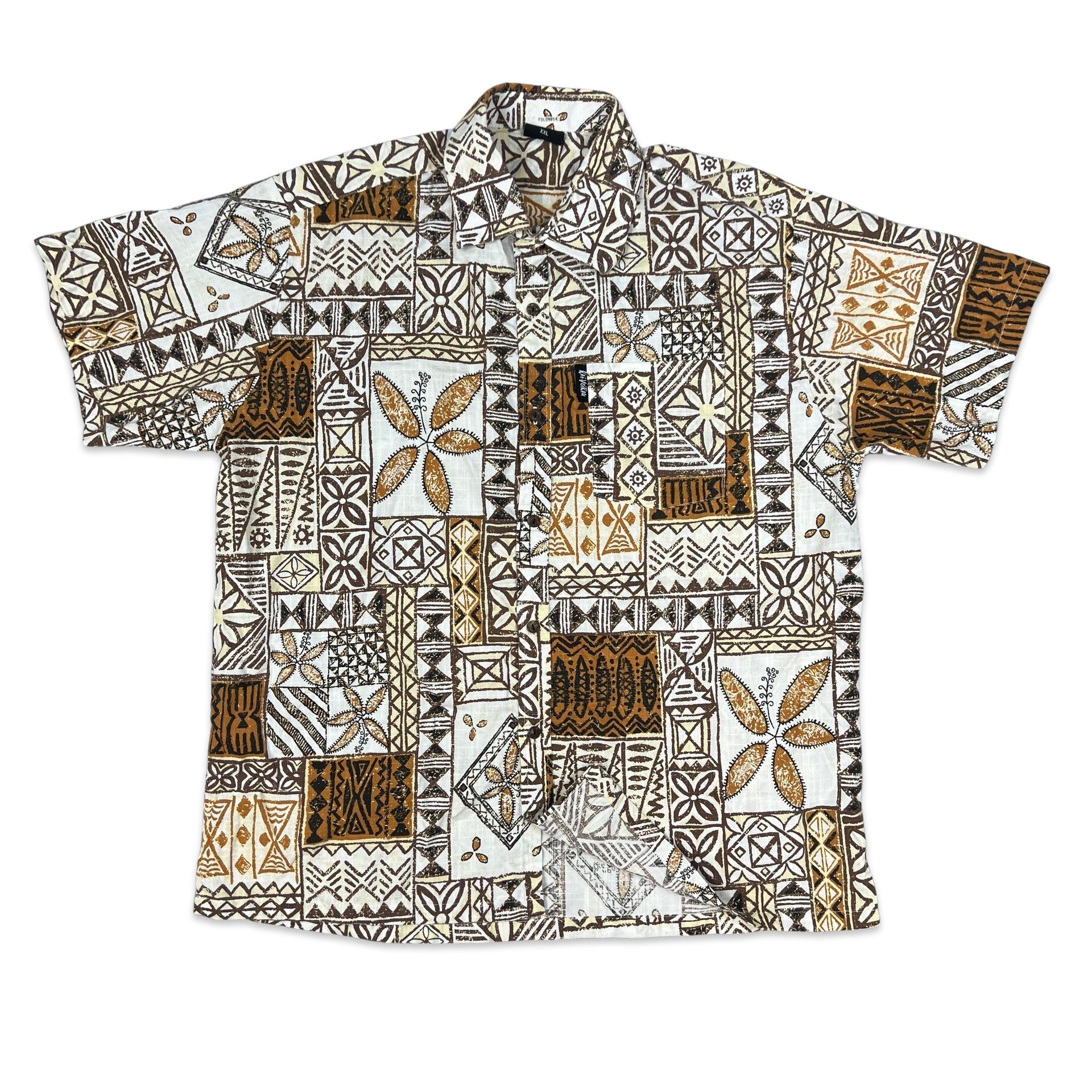 Vintage Y2K White & Brown Abstract Print Hawaiian Shirt XL XXL