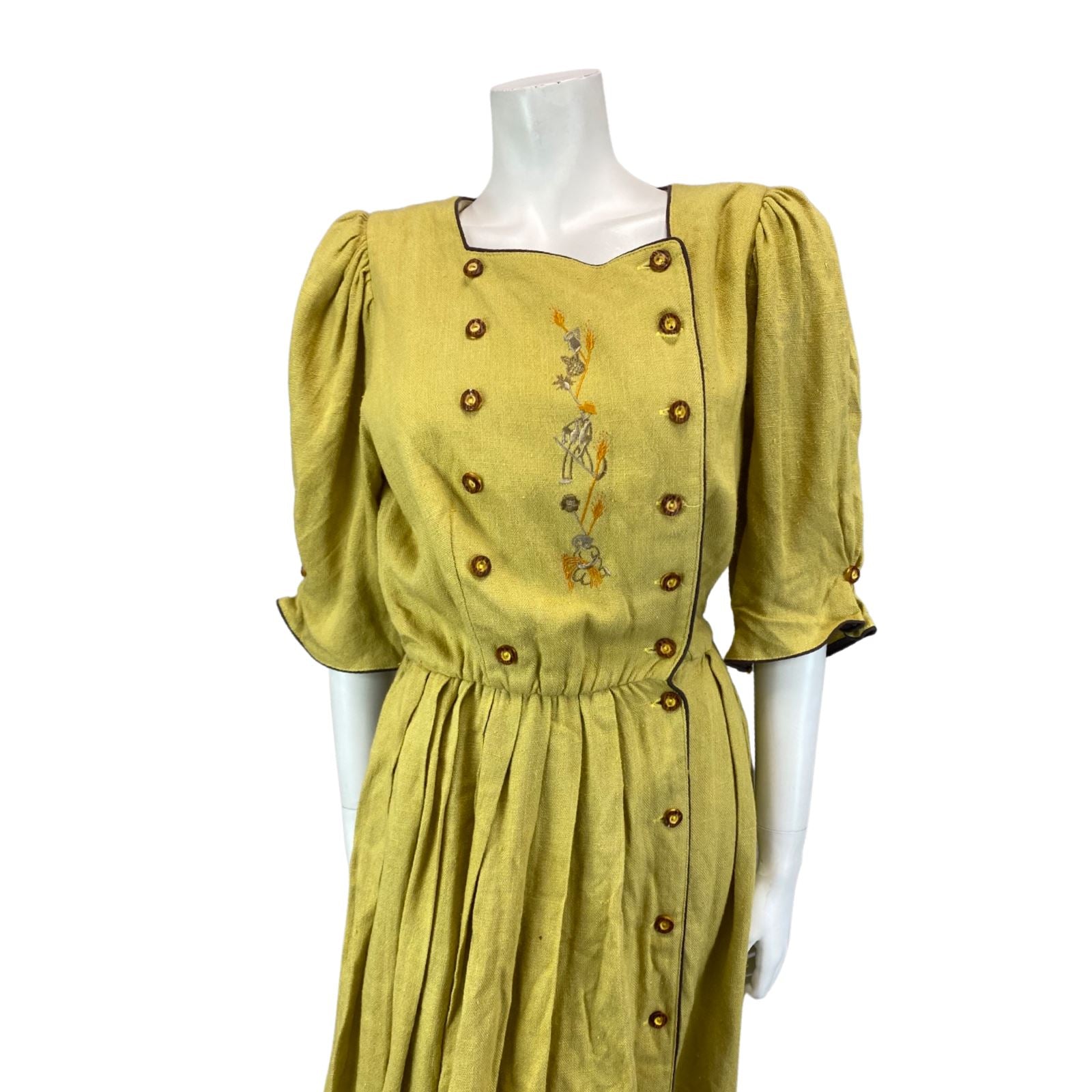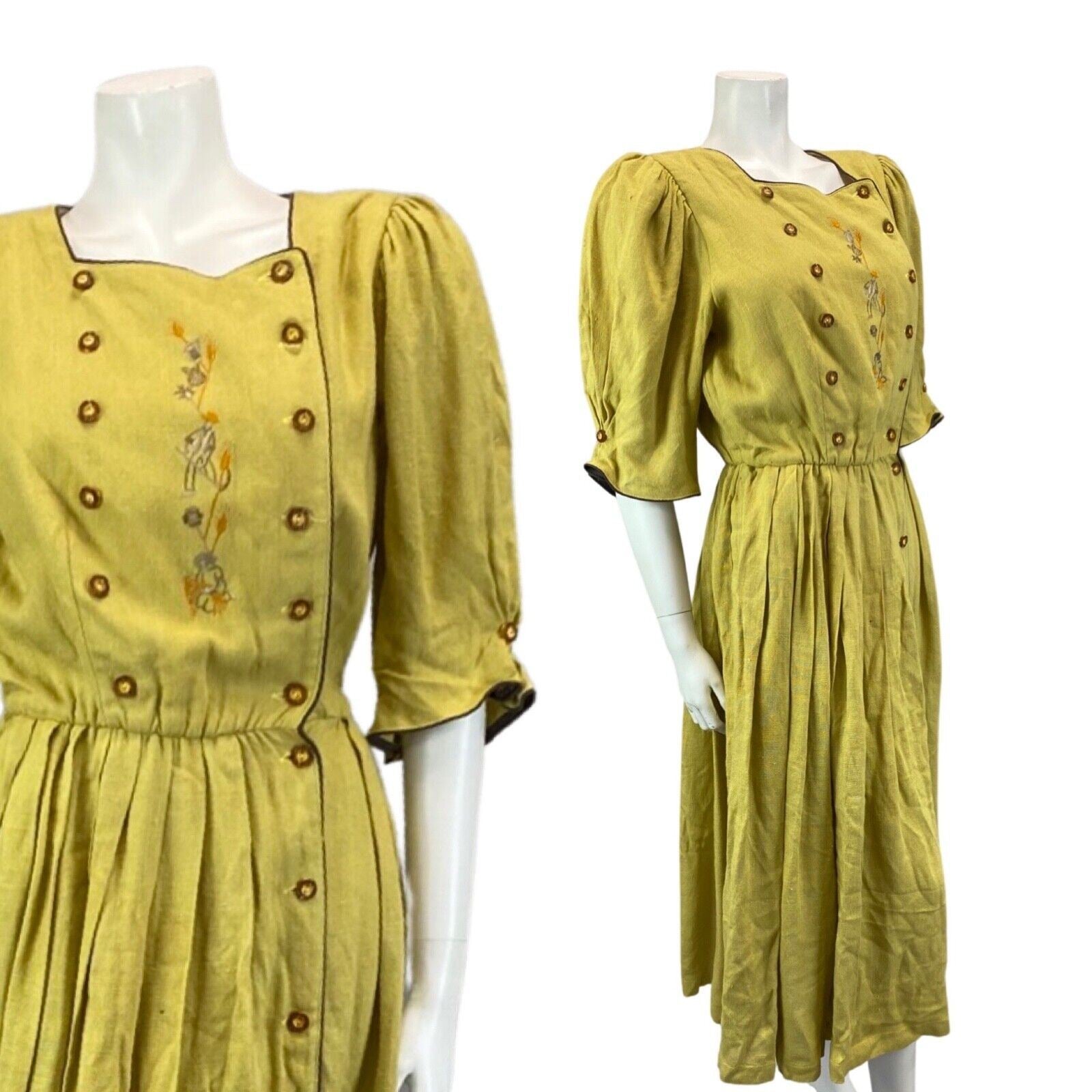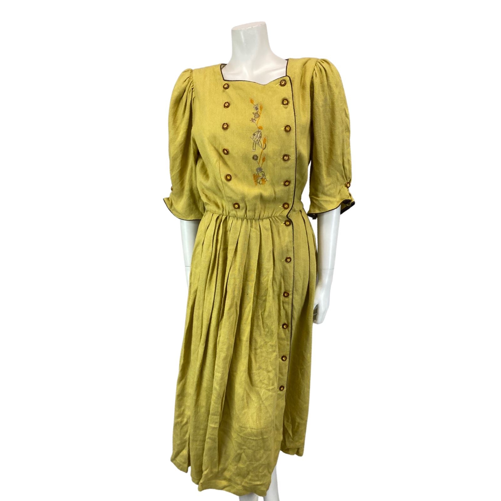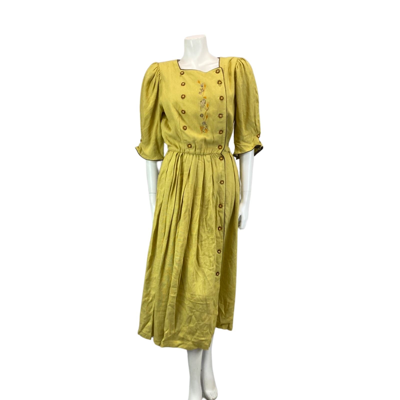 Vintage Yellow Authentic Tyrolean Dirndl Short Sleeve Button Up Maxi Dress M