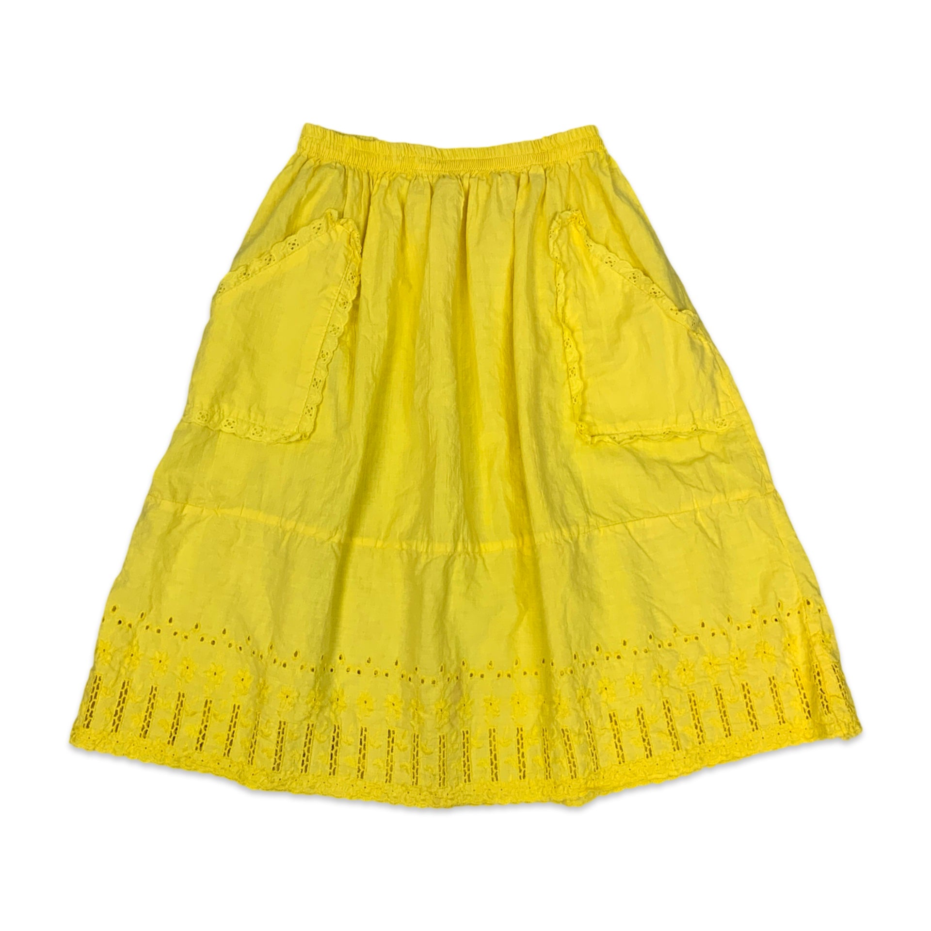 Women's vintage summer skirt. Elasticated waistband with 2 front pockets & embroidered floral detail.
