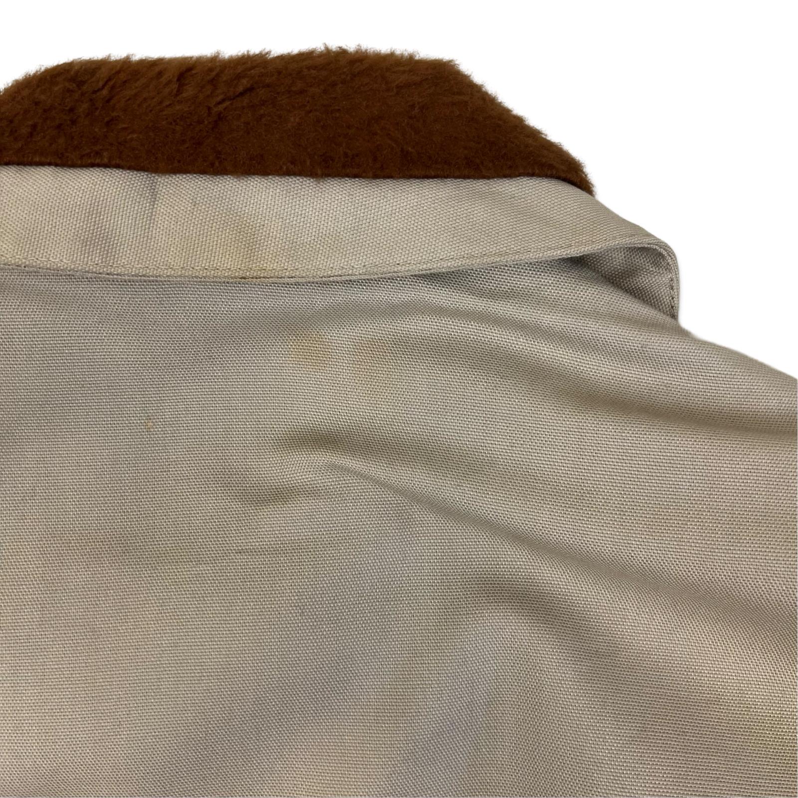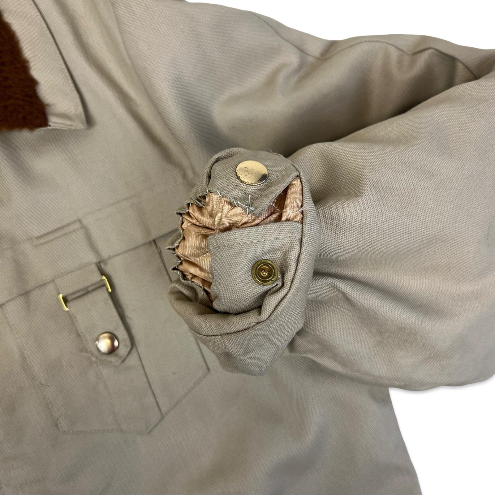 Here we have a super cool USA beige duck canvas Sherpa lined hunting/outdoor coat, lovely plush warm lining, cool oversized metal zipper, rounded collars & 4 external pockets, this is in excellent condition, has a very long sleeve of which the cuff has been turned under & tack-stitched, if you require 2 inches longer its a 2 min job to snip the stitches & lengthen