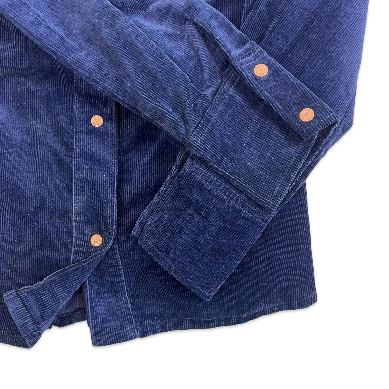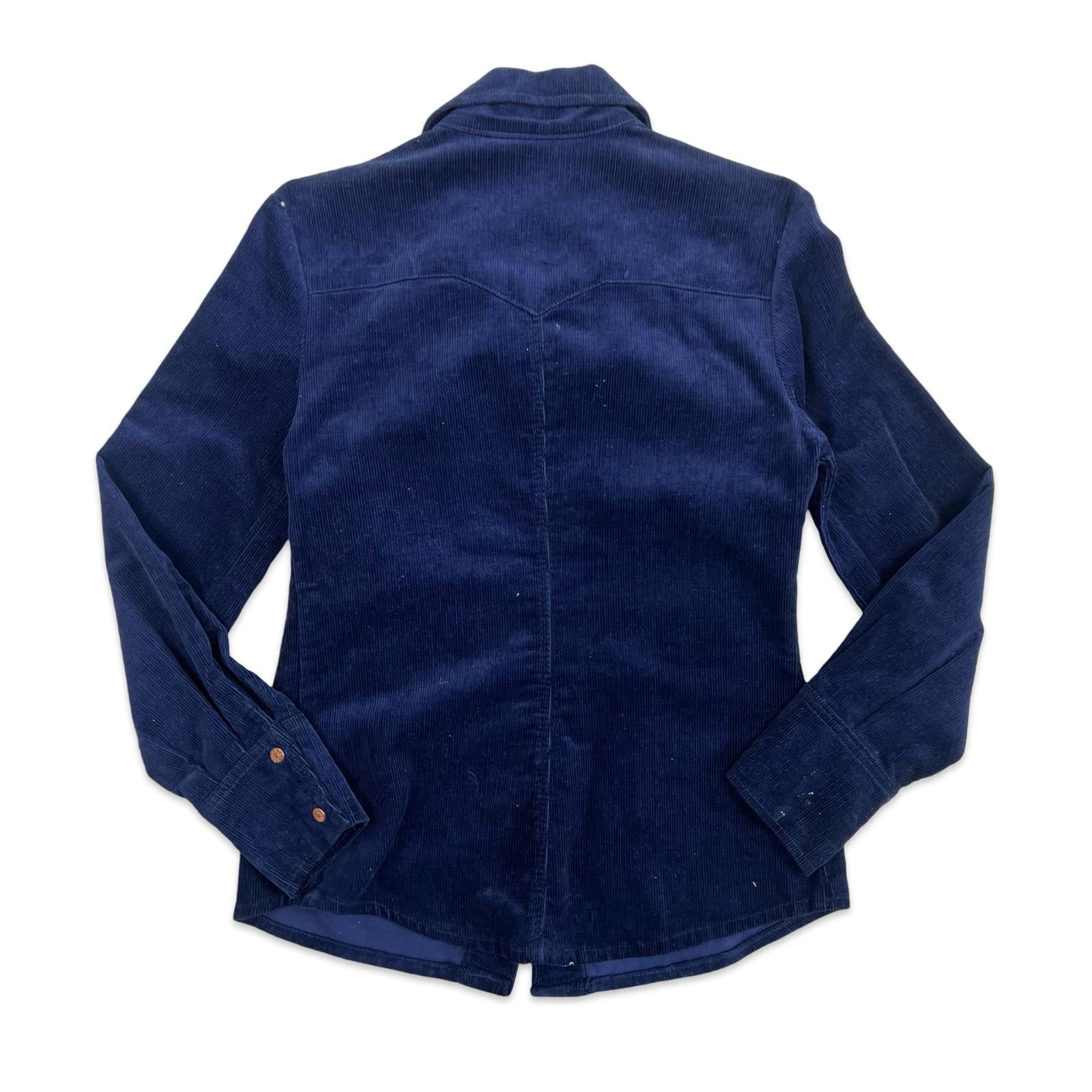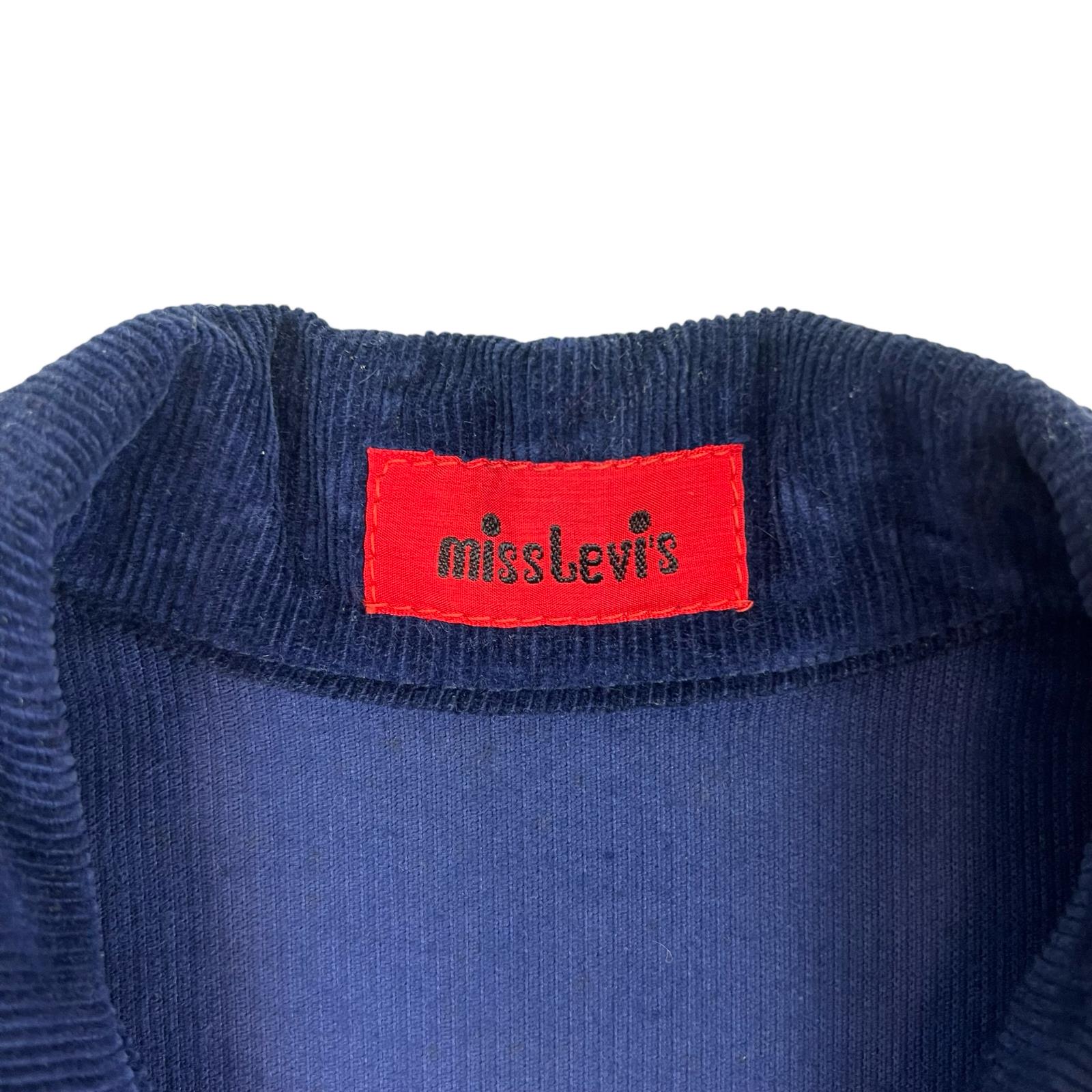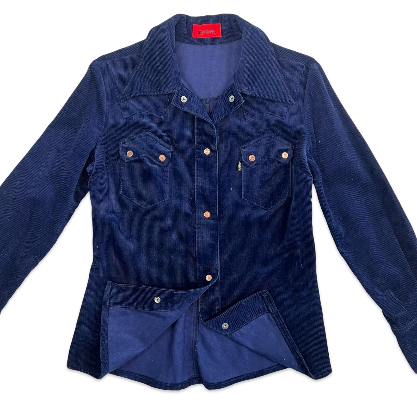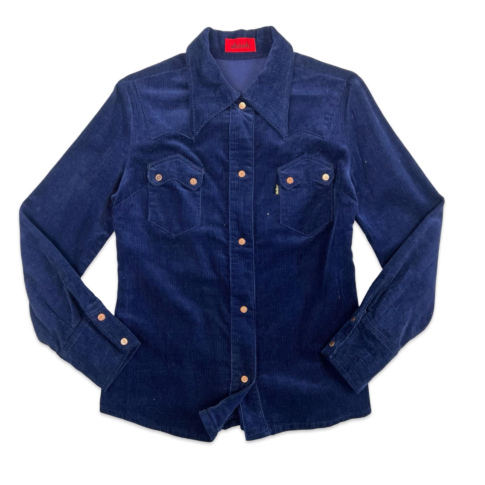 Here we have an amazing and rare vintage 1970s big E black & gold tab ladies MISS LEVIS navy corduroy western shirt with copper poppers, western shoulder yokes, oversized 70s collars, sawtooth pockets and fitted ladies tailoring