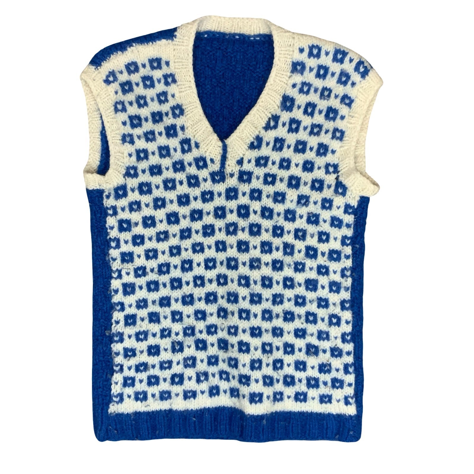Vtg 70s Blue White Geometric Hand-Made Casual V-Neck Wool Sweater Vest S UK 8