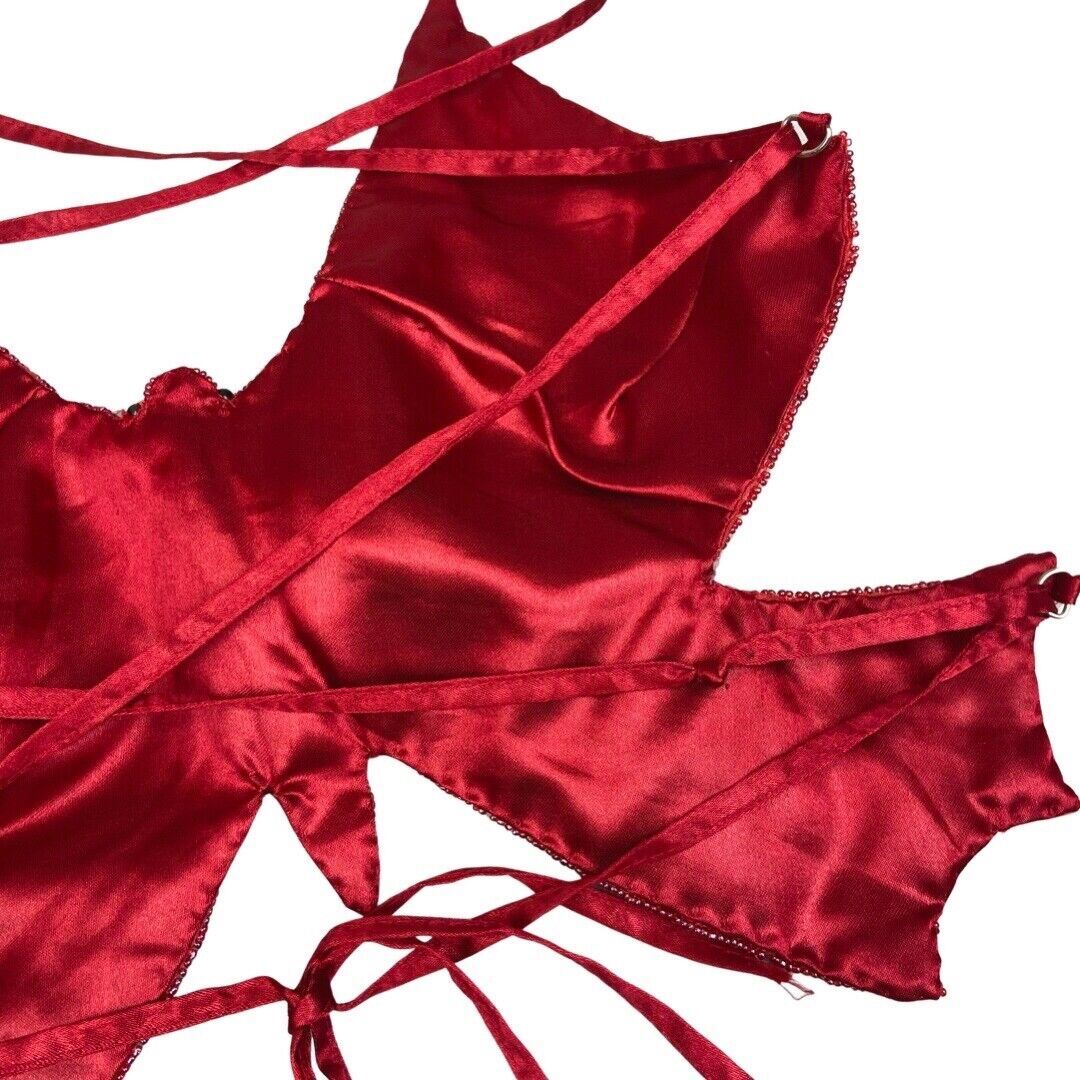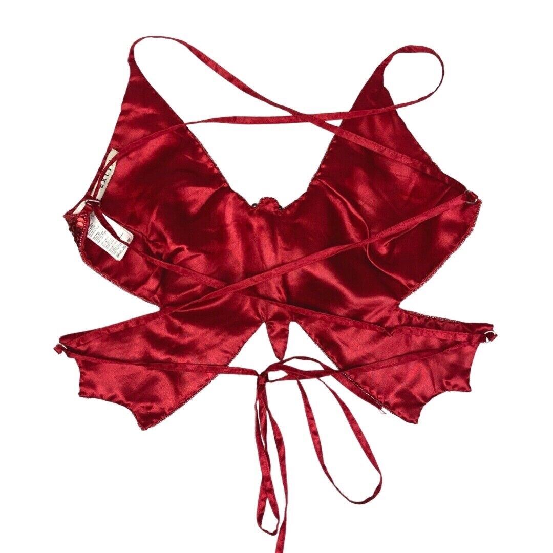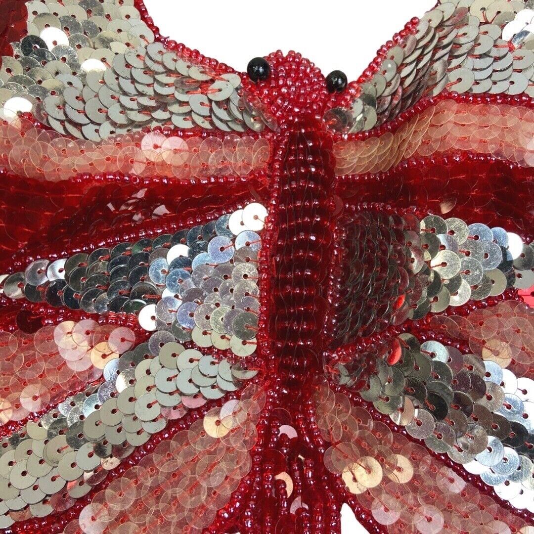 This is a striking 90s/Y2K embellished butterfly top. This item has a lace up back with a red nylon stain feel string. This makes the item adjustable in size. The nylon lining is a sat feel/look bold red fabric. The centre of the top is the centre of the butterfly with the body and eyes made from beading and sequins. Both wings are made fro gorgeous silver and red beads/sequins to create this amazing unique piece. This item is in overall amazing condition.