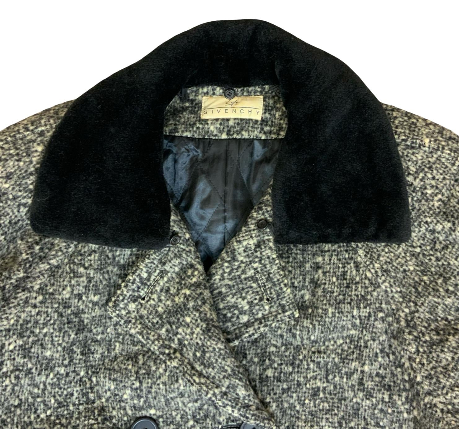 Vintage 1980s/90s Givenchy wool blend tweed coat in speckled grey with a double breasted front using large black buttons, notched label collar with a detachable black fur trim and two outer pockets. The inside is lined with a black quilted lining. The materials label is in a different language so is difficult to accurately say but we would suggest it is a wool blend outer and a polyester lining.