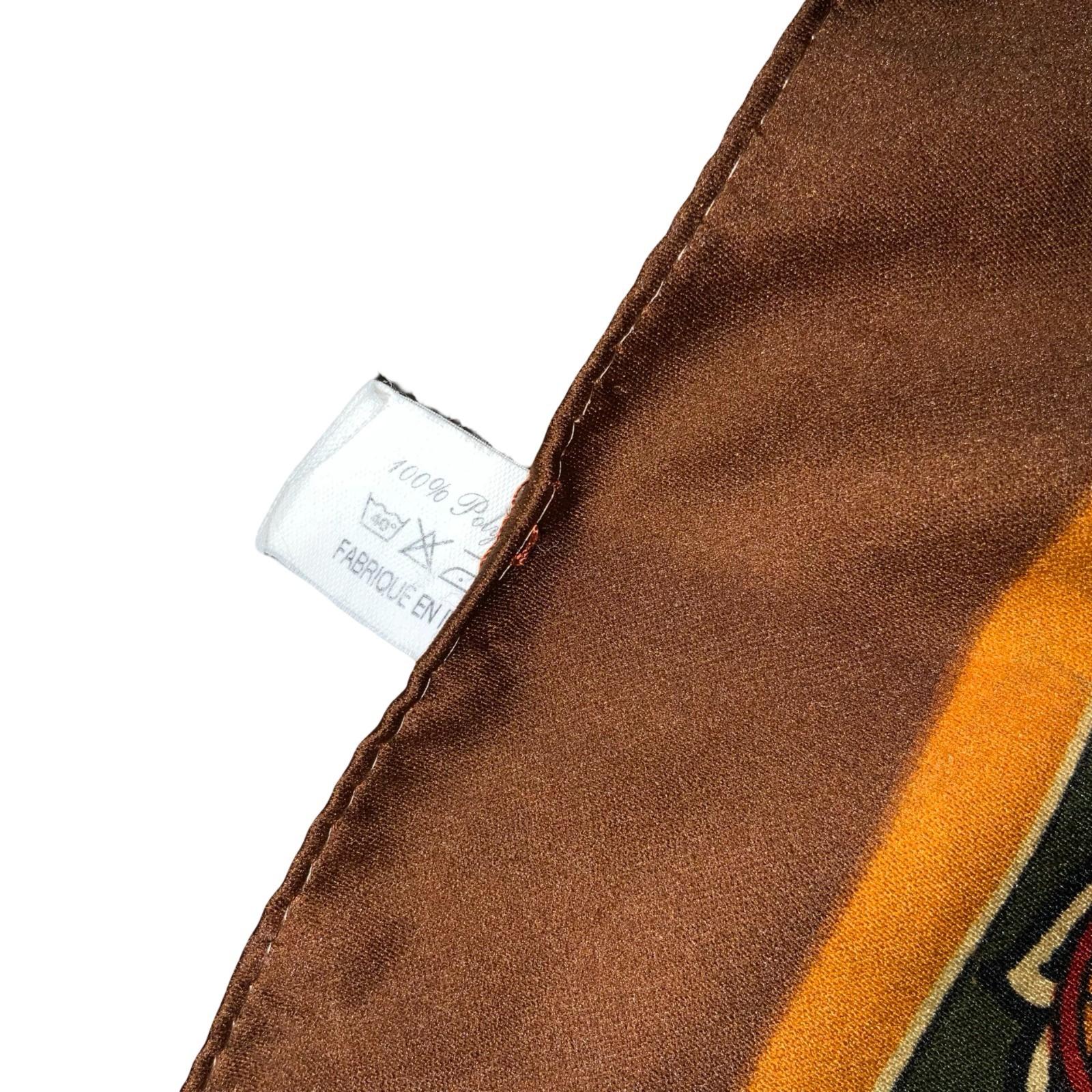 Vintage 1980s brown, red, green and yellow floral and paisley patterned square scarf. It is a soft, lightweight and smooth fabric made in Italy using 100% polyester for durability. It has been hand rolled and hand stitched, showing high quality and care to detail. The central motif is a floral design surrounded by an intricate paisley border. Stunning piece that is versatile in its uses - it can be used as a neckerchief, head scarf, a handbag accessory, or even used as a top.