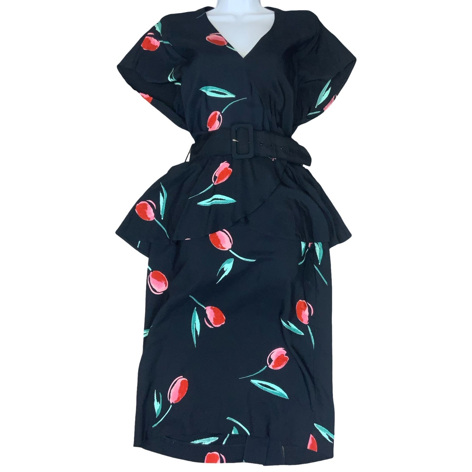Vintage 1980s does 1940s Gila Grunert Creation wrap style peplum dress in black with a pink tulip design. It has a deep v neckline, short sleeves, elasticated waistband and subtle pleats on the skirt with an added wide belt. Made from 100% viscose with a 100% polyamid internal lining.