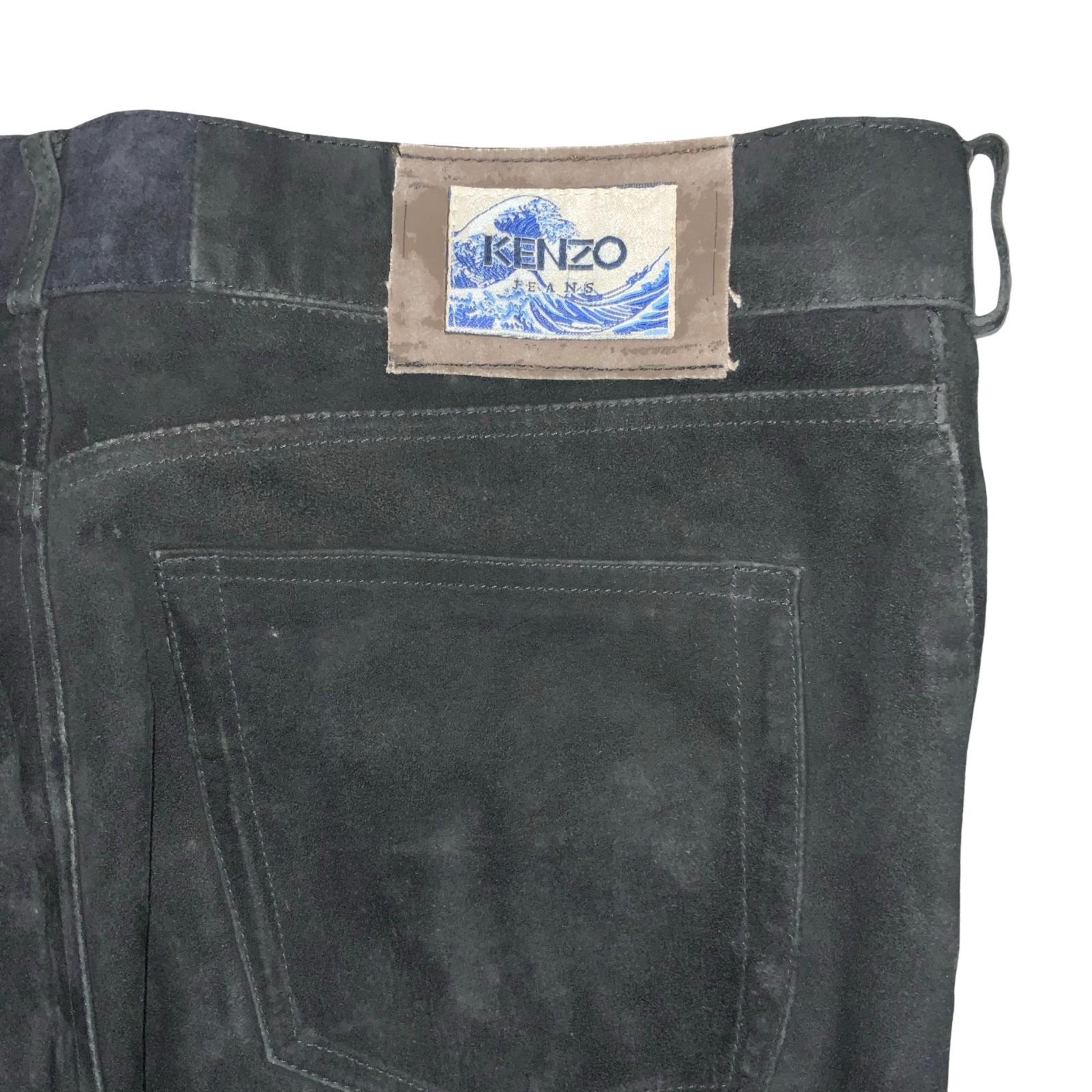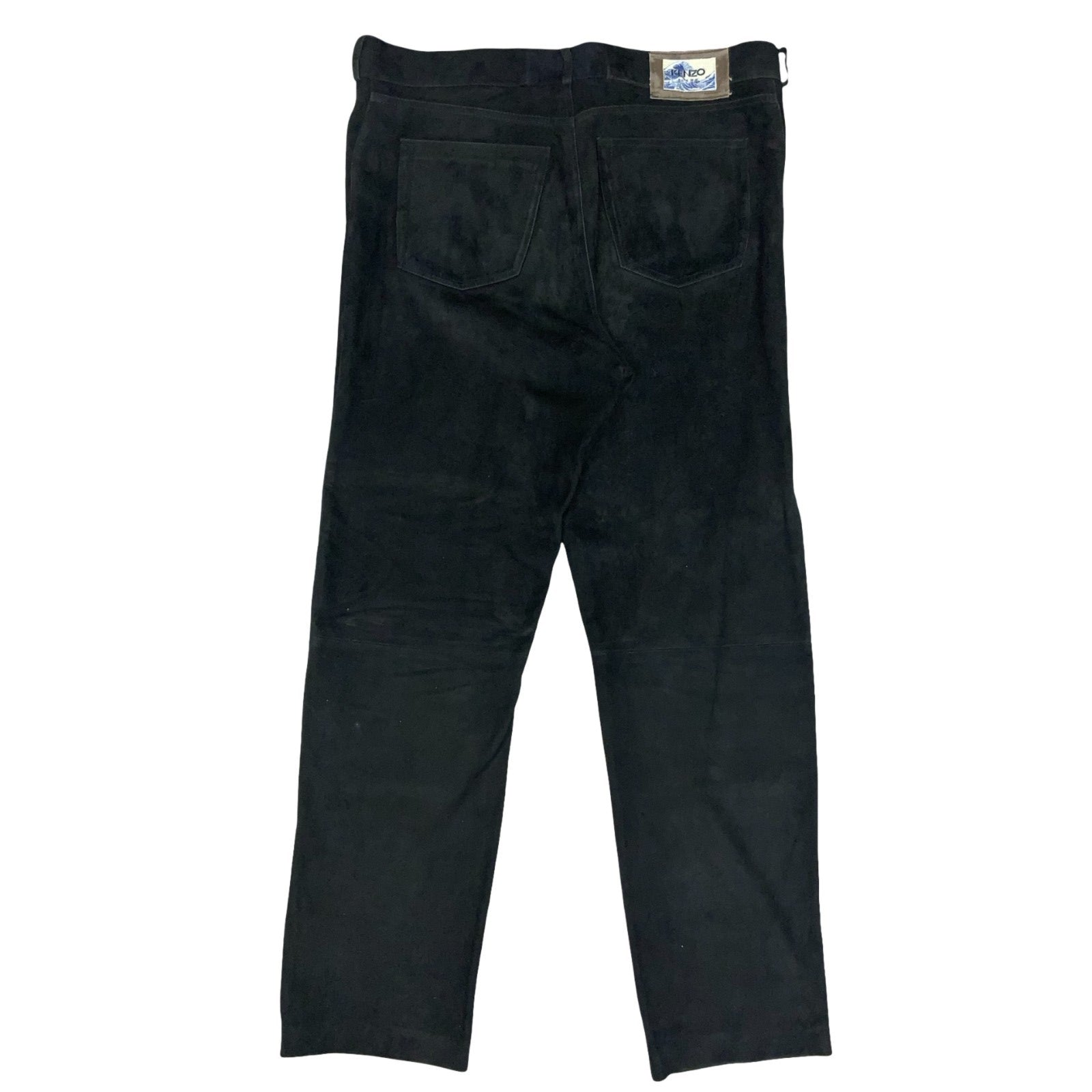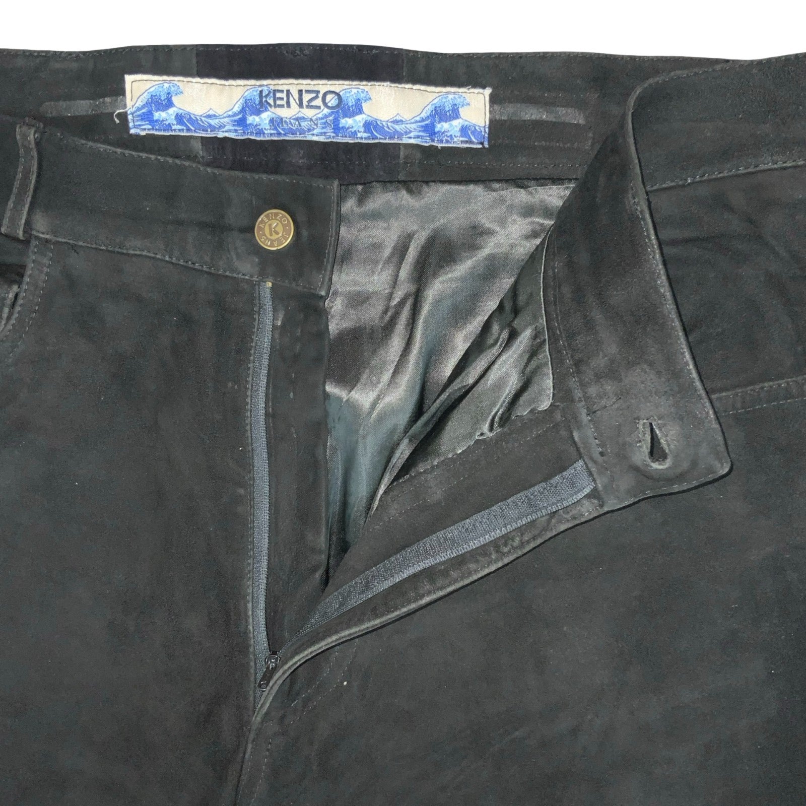 Vintage 1980s Kenzo Jeans branded straight leg trousers with no mention of materials but they feel so soft, almost velvet in texture and internally lines with a silk lining. Entirely in black with side pockets, bum pockets, and fastened by a front zipper and button fastening. They have the iconic 80s Kenzo logo featuring the famous ukiyo-e artwork by Katsushika Hukosai stitched onto the internal waistband and the external of the waistband on the back.