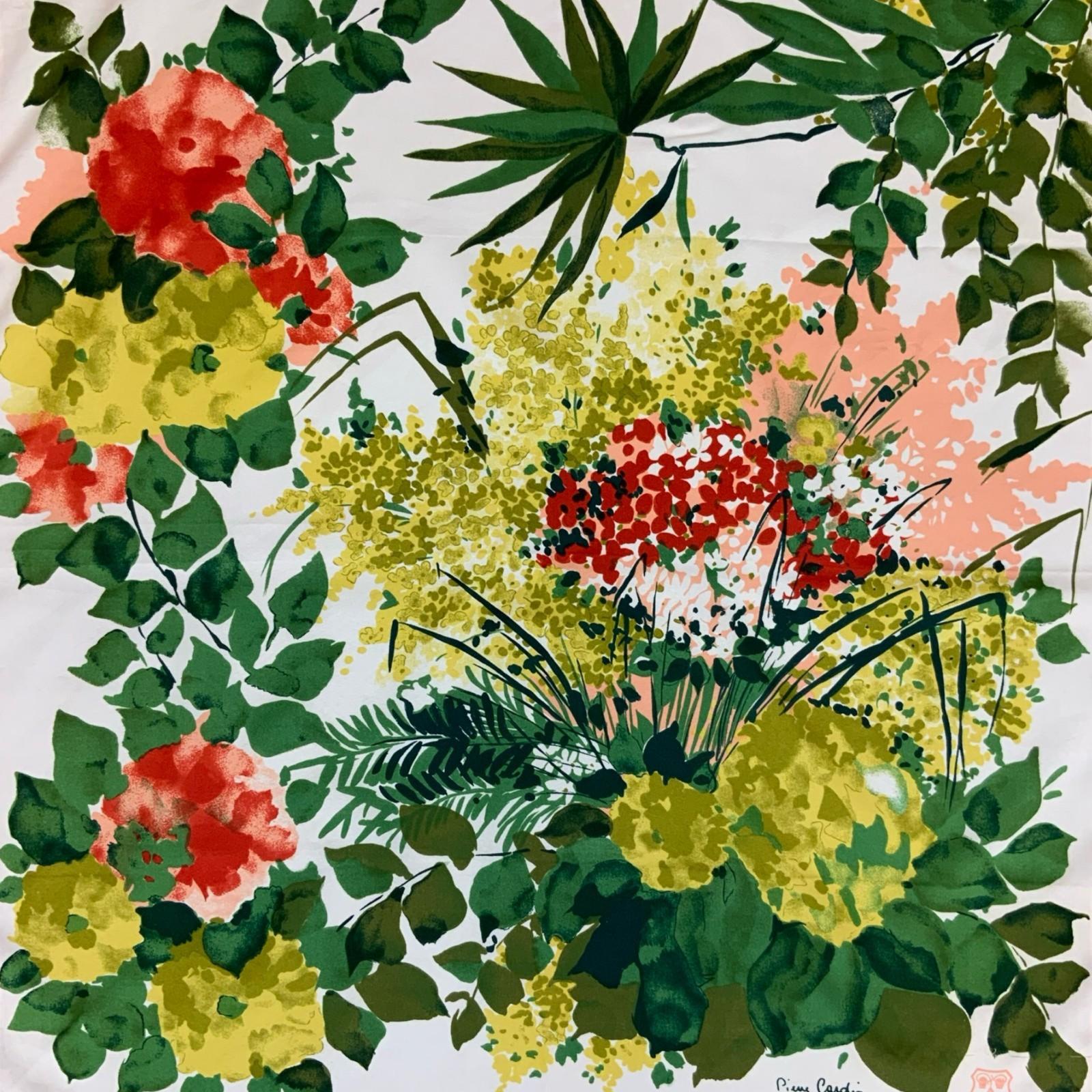 Vintage 1980s Pierre Cardin scarf with a vibrant floral print framed by a red border. 100% polyester.
