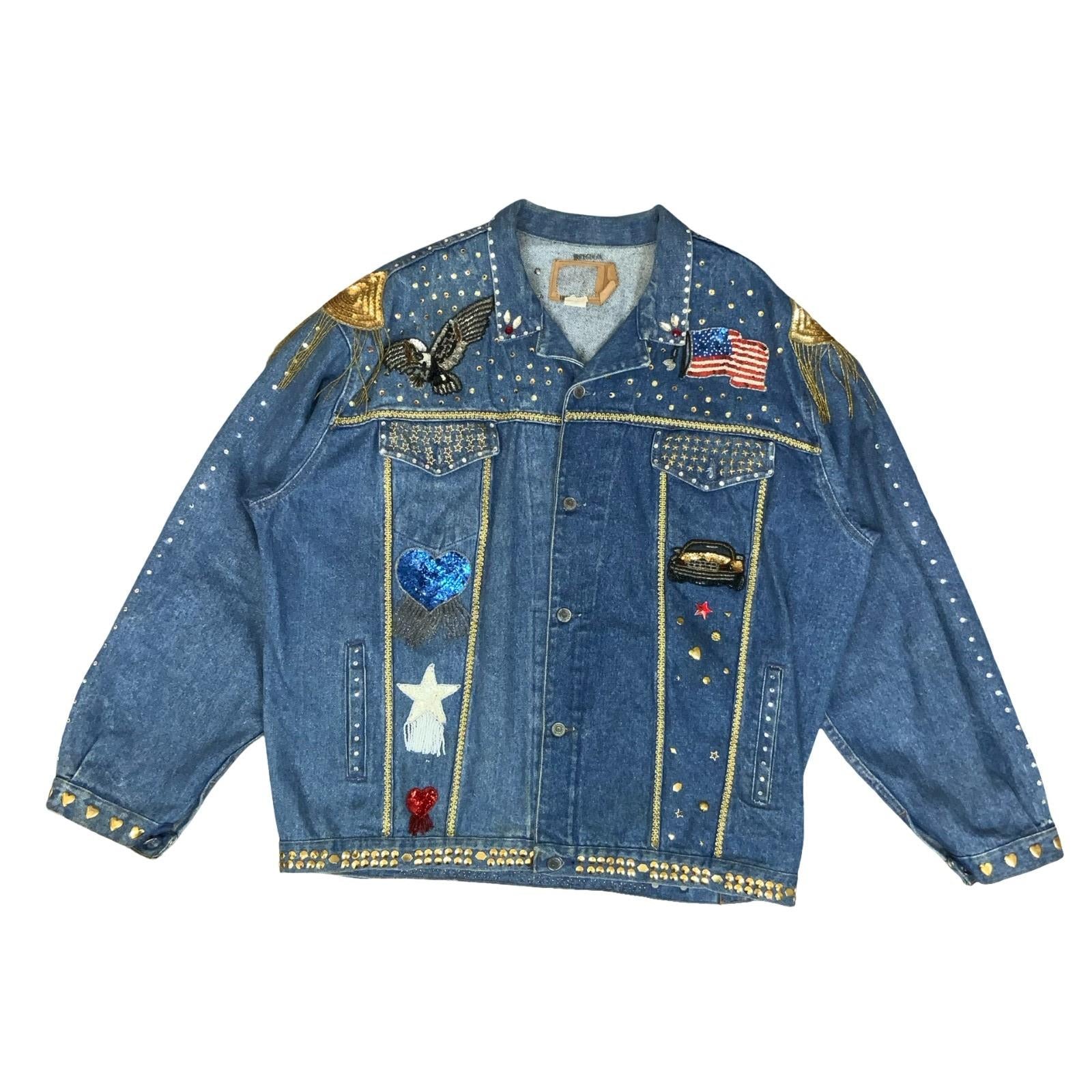 Vintage 1980s/90s oversized denim jacket in blue. The label has been purposefully cut out by its previous owner, but from the buttons we can say the brand is 'The Gap'. The jacket has been heavily embellished with sequins, embroidery and studs in various forms with a Southwestern/Texas theme, including "I heart Texas" embroidery, union jack, eagle, and chilli peppers. We believe due to the label being removed that the embellishments were added by the previous owner and not the original brands design. They are very well stitched onto the garment and give the overall jacket an enhanced look.