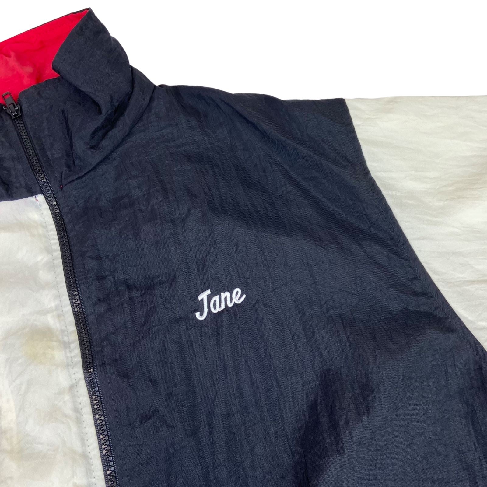 Here i have an original 1980s ladies shell/windbreaker jacket embroydered with a Carolina line-dancing troupe and the name “Jane” on the front