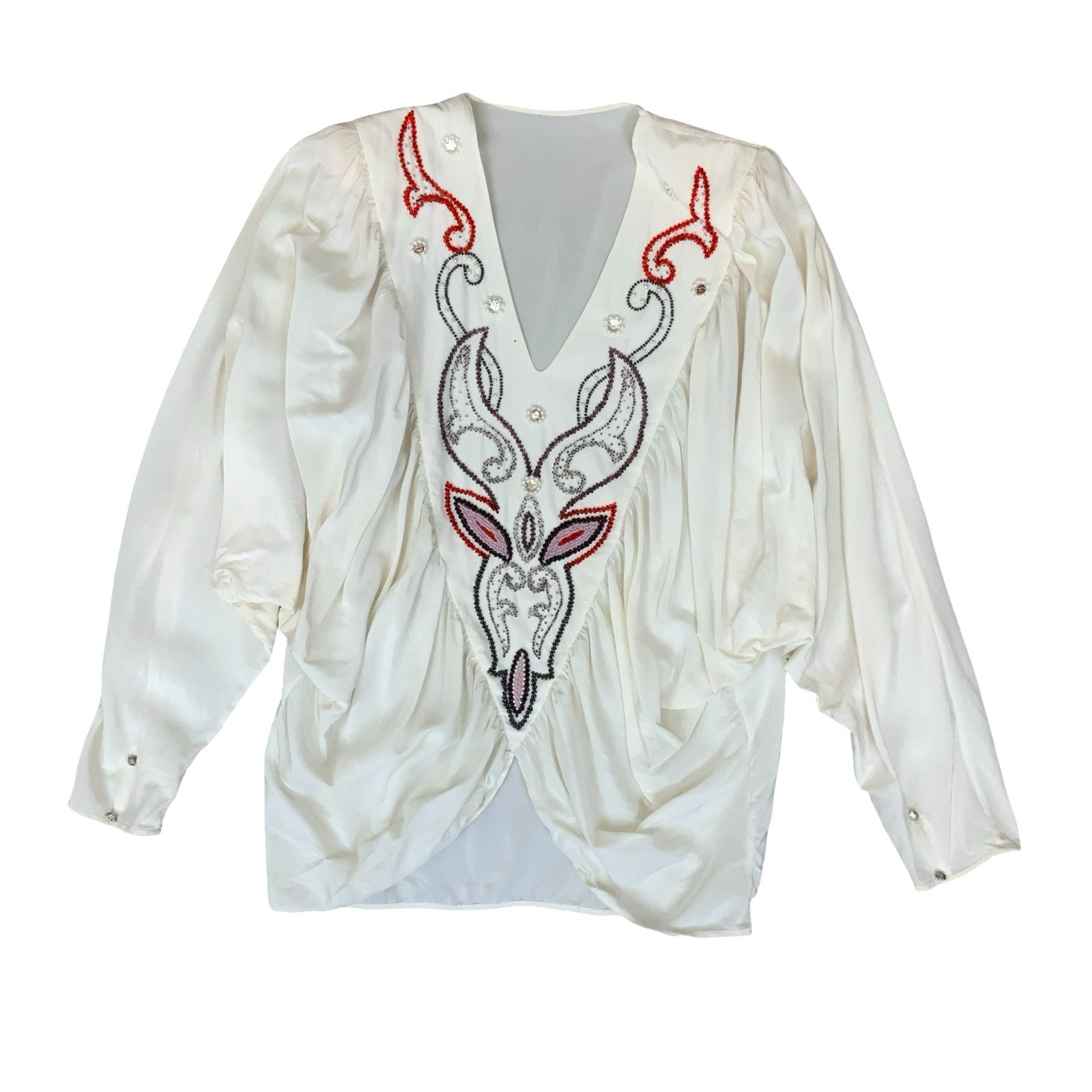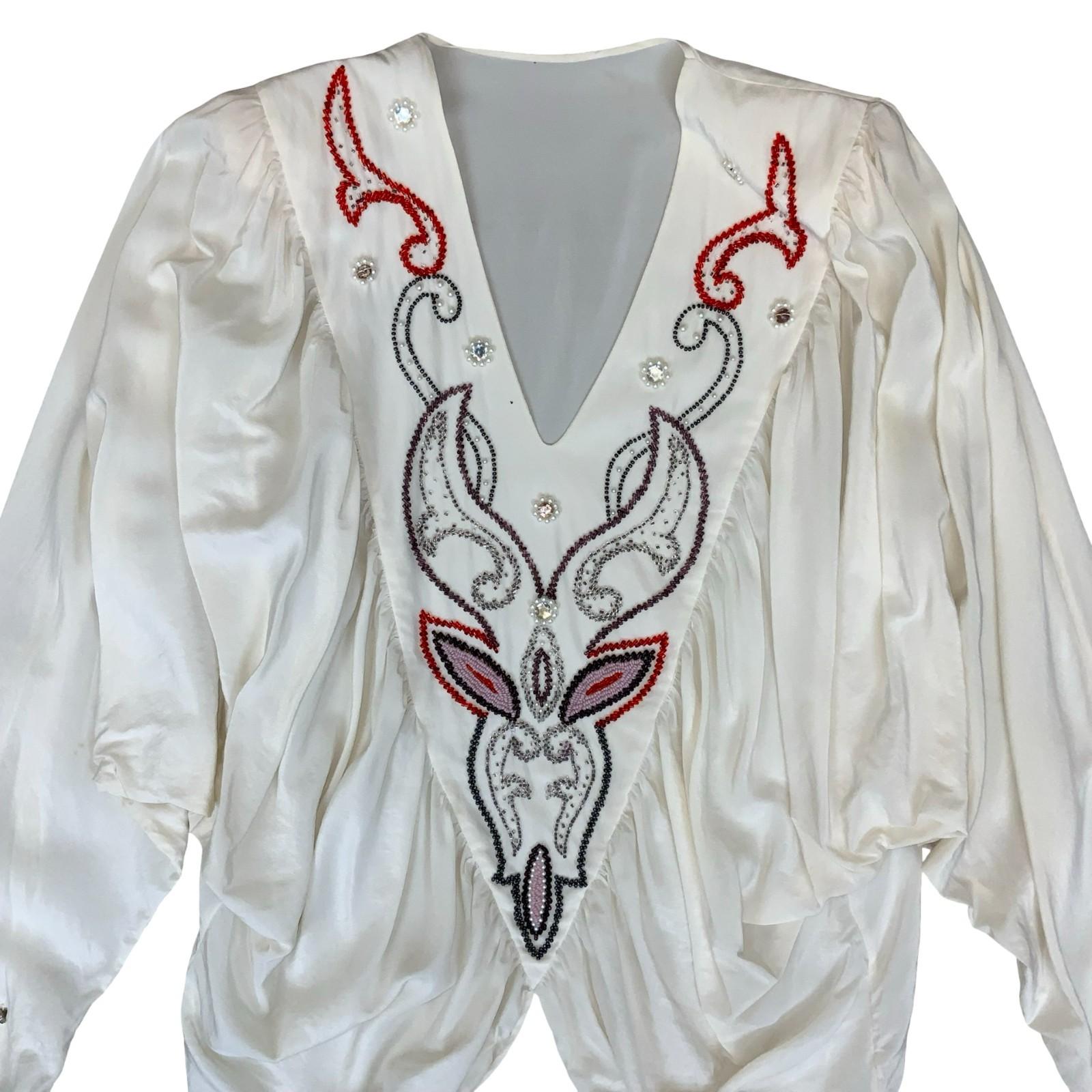 Vtg 80s White Embroidered V-Neck Bat-Wing Power Dressing Party Blouse UK 16