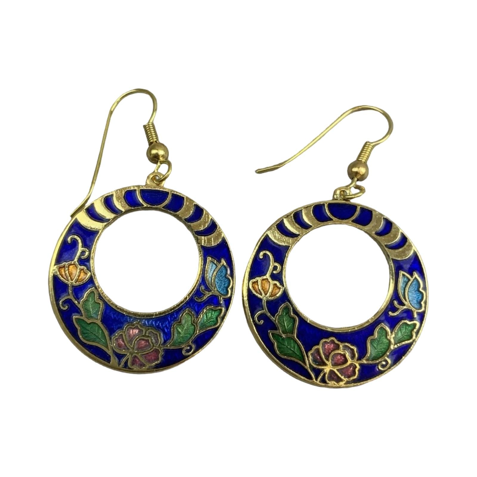 VTG 90S BLUE GOLD GREEN ART DECO FLORAL ENAMEL GEOMETRIC DROP EARRINGS ENV11