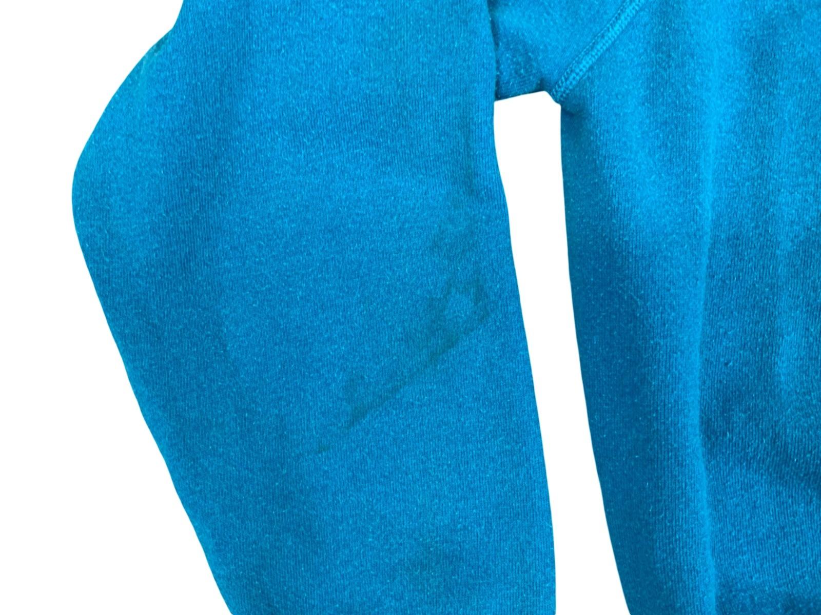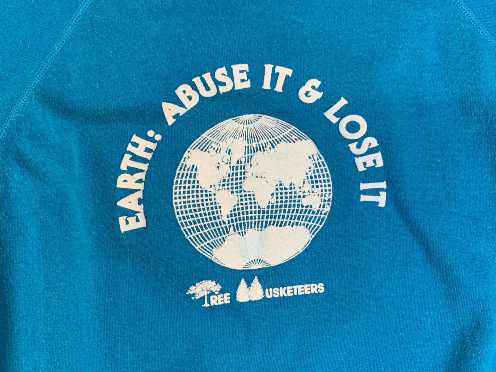 Here we have a really cool piece of vintage Americana, a 1990s aqua blue Hanes 50/50 sweatshirt with puff print back logo for environmental group “tree musketeers” with a globe logo and slogan “earth: abuse it & lose it”.
