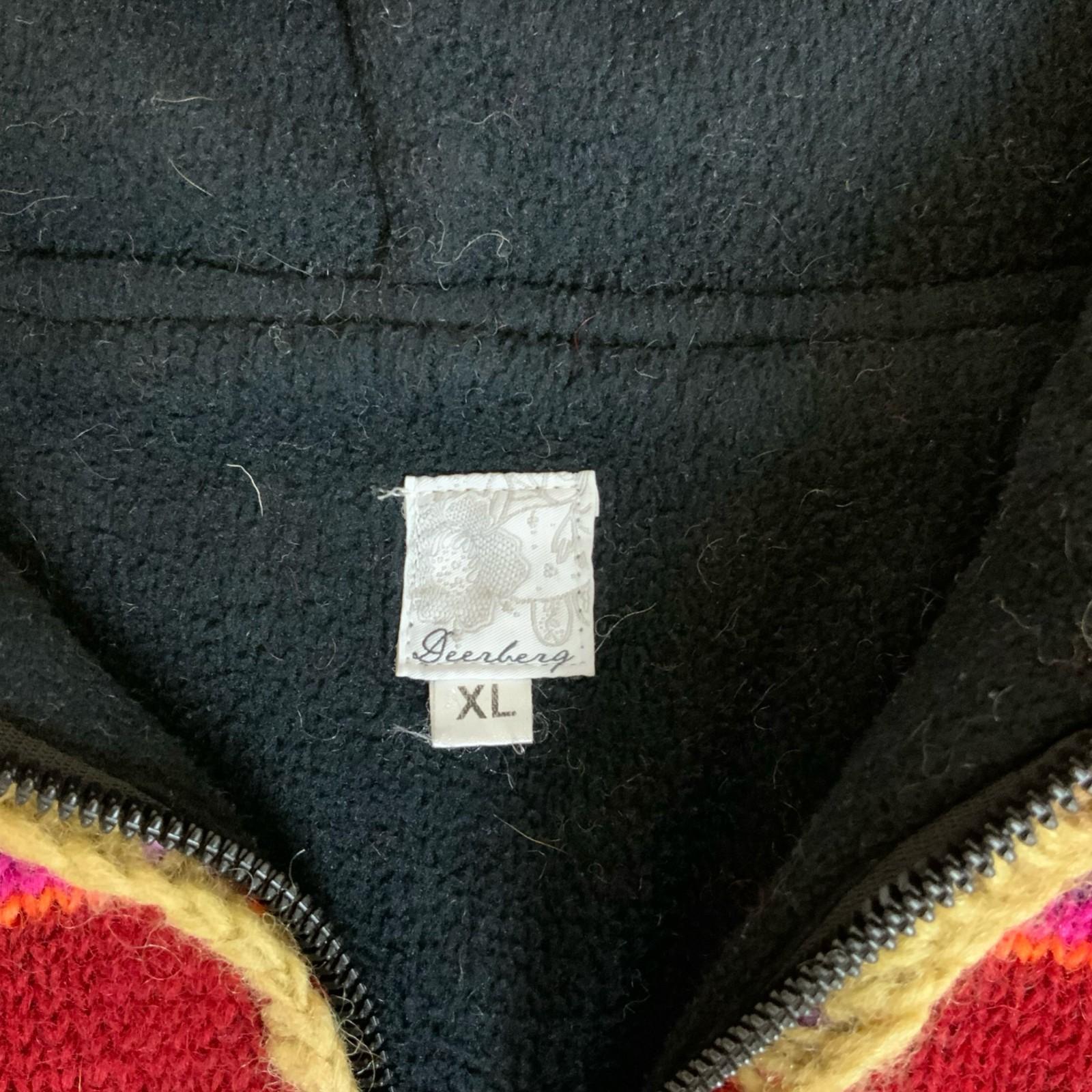 Vintage 1990s Deerberg zip-up jacket with a fleece lining and beautifully knitted patchwork style external. It features a striped design of predominantly reds, with purple, green, and orange. It is a statement of a jacket with its geometric embroidery and bold choice of colours. It will certainly keep you warm during the colder months as it is made from 100% wool for the outer layer, and 100% polyester inner lining. Beautiful fleece lined jacket. Excellent quality.