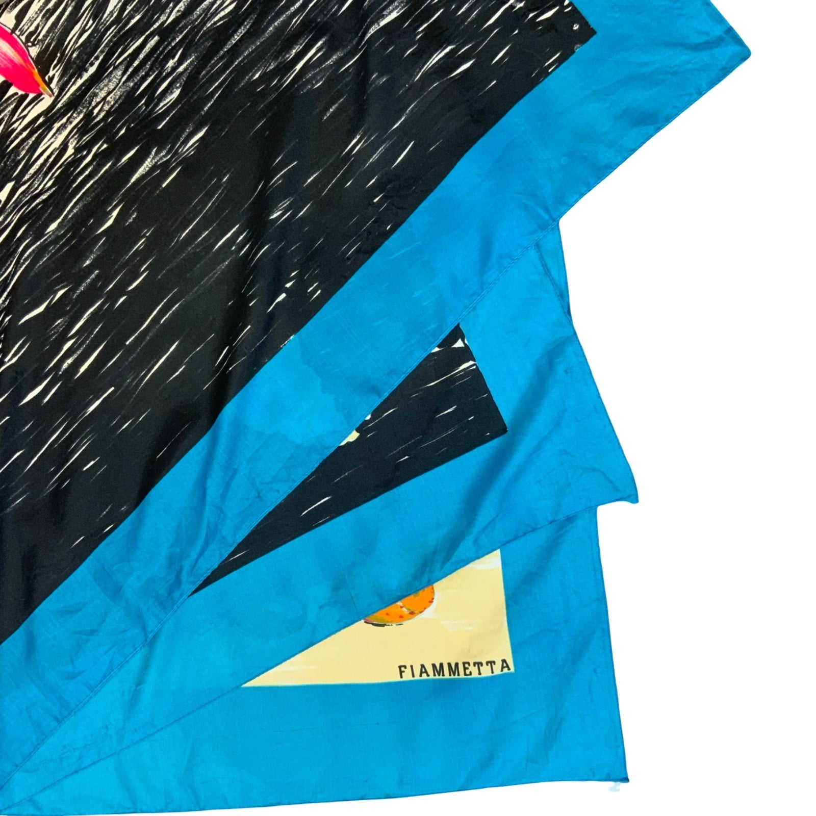 Vintage 1990s Fiammetta large scarf that also doubles as a beach cover-up or tapestry decor. It has striking graphics of a seashell with flowers in blue, white, yellow, pink and black.