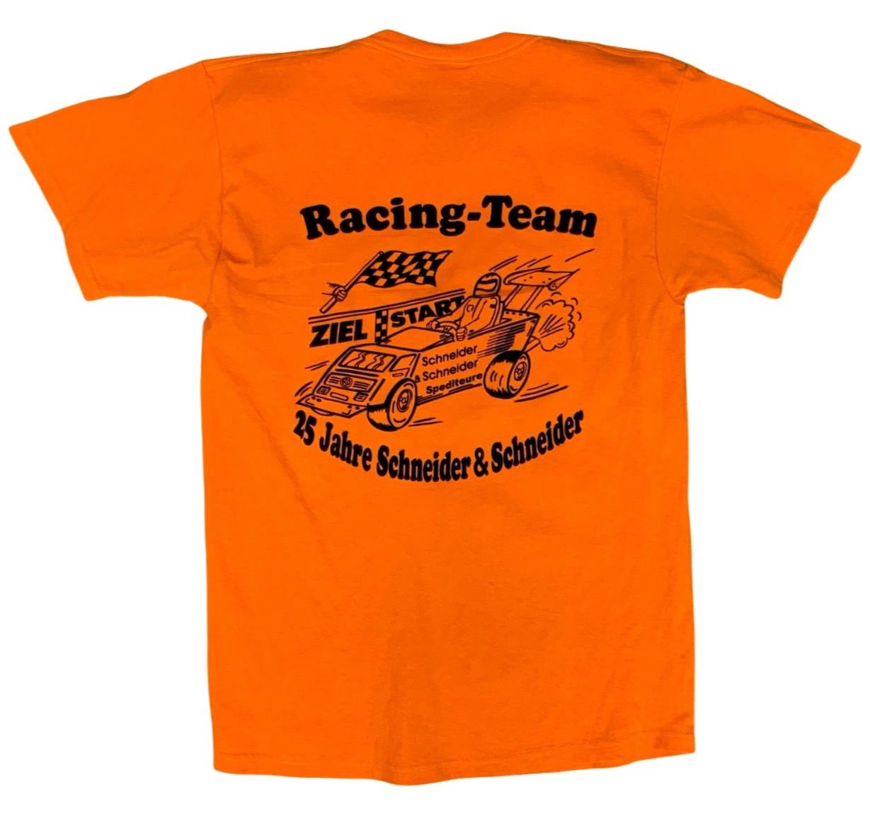 VTG 90s GERMAN HOT ROD RACING TEAM BACK FLOCK PRINT ORANGE T SHIRT S