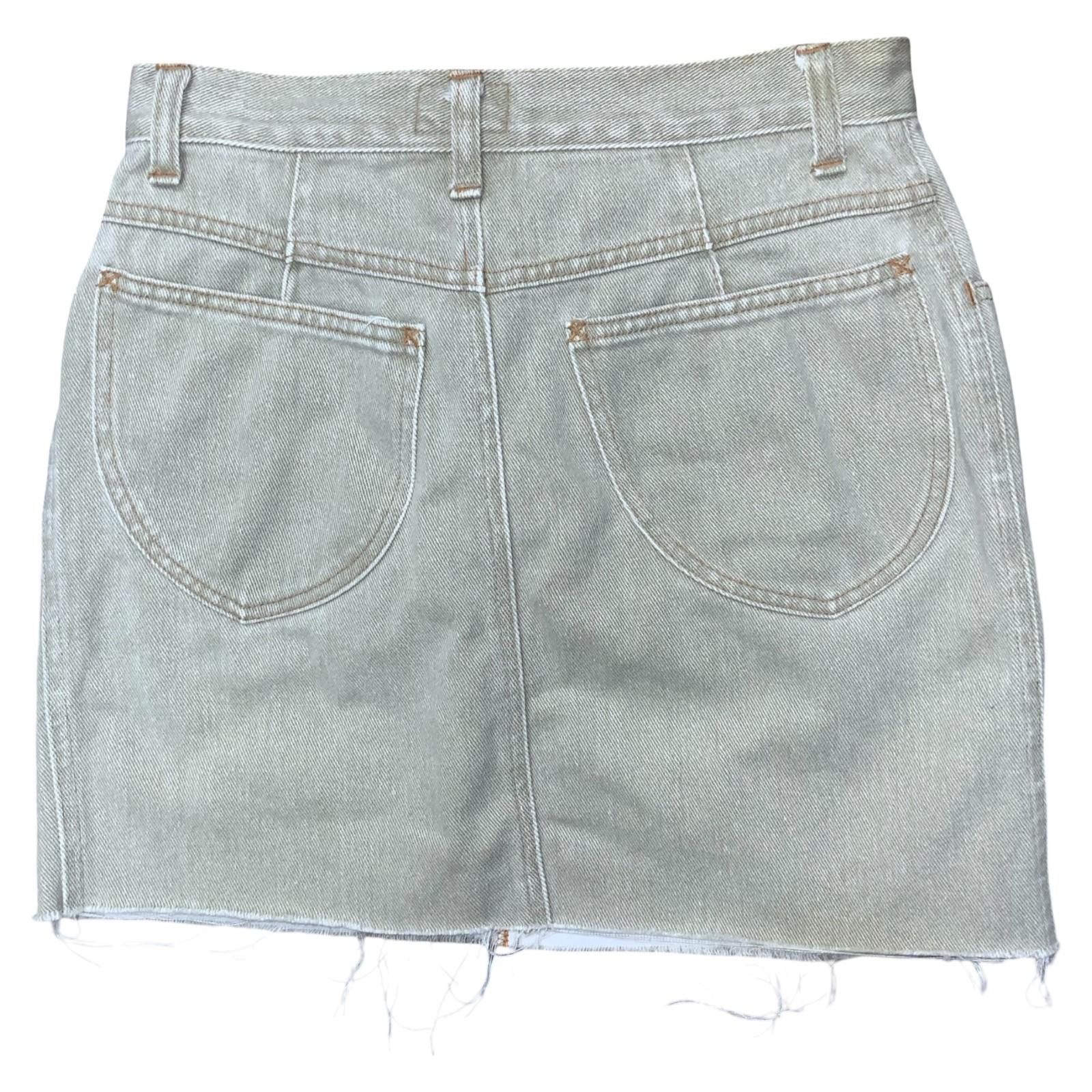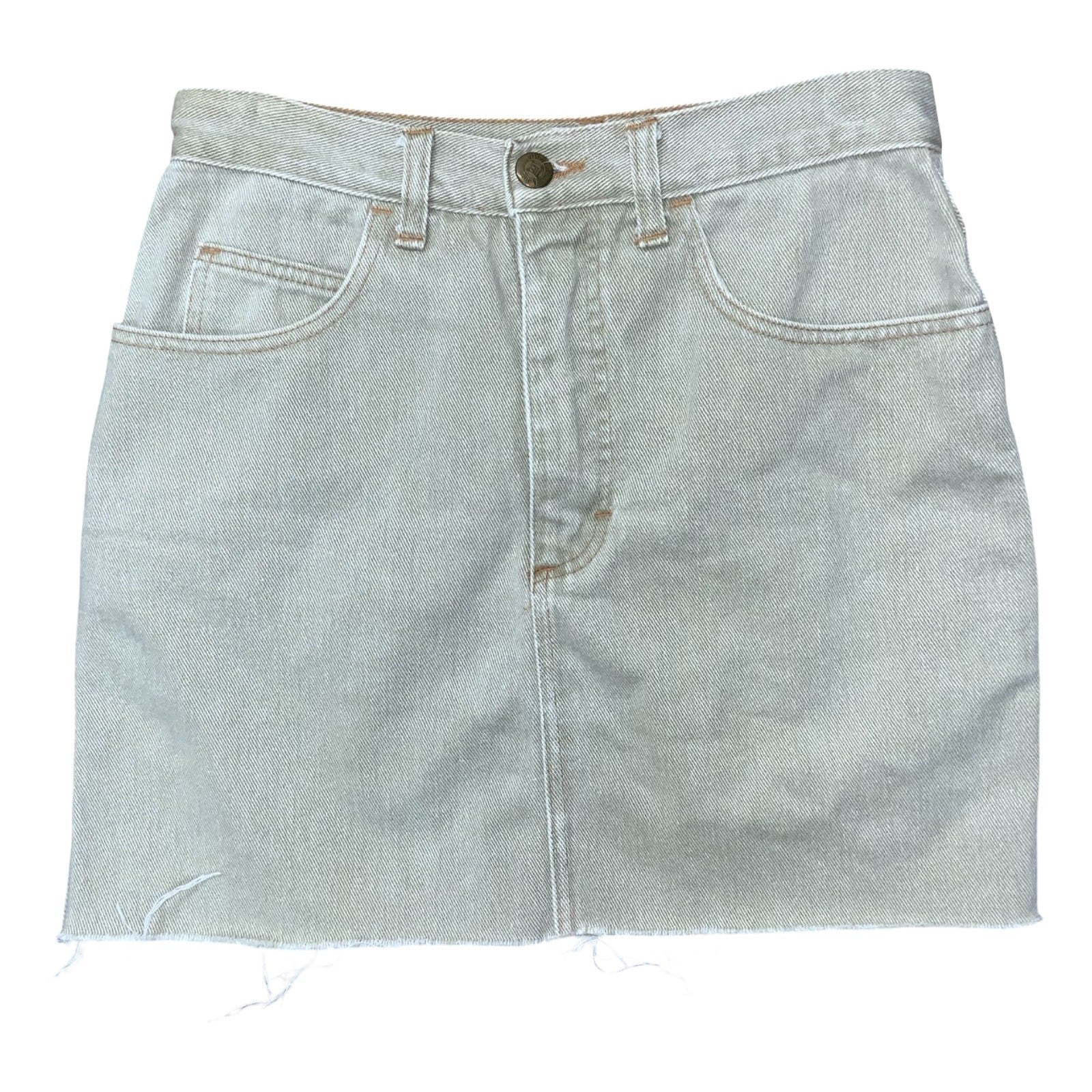 Vintage Laura Biagiotti mini denim skirt in a light cream cream colour. It it high waisted in design with a frayed hem, button and ffly front fastening, side pockets and a figure-hugging fit. This would be perfect paired with your favourite knee-high boots and a cable knit jumper to be autumn ready.