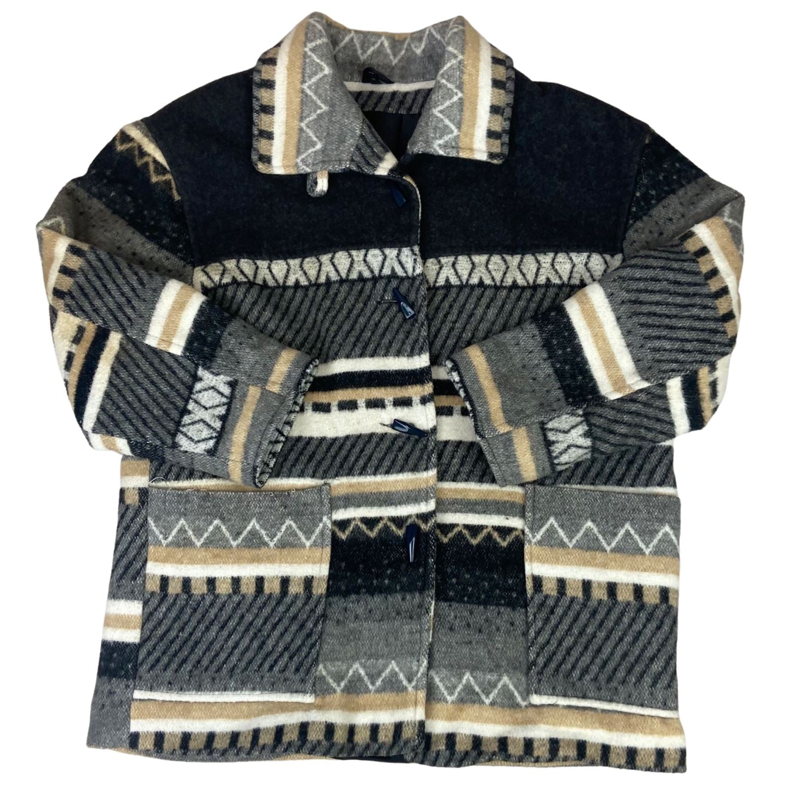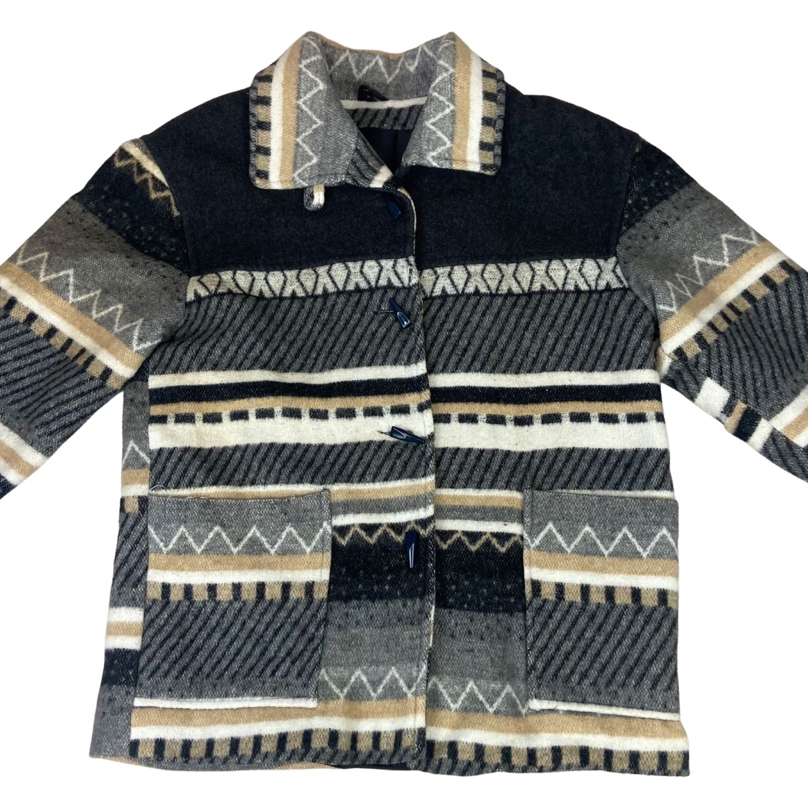 Here we have very cool vintage 90s Aztec style wool coat with toggle opening, 2 front patch pockets and nylon lining