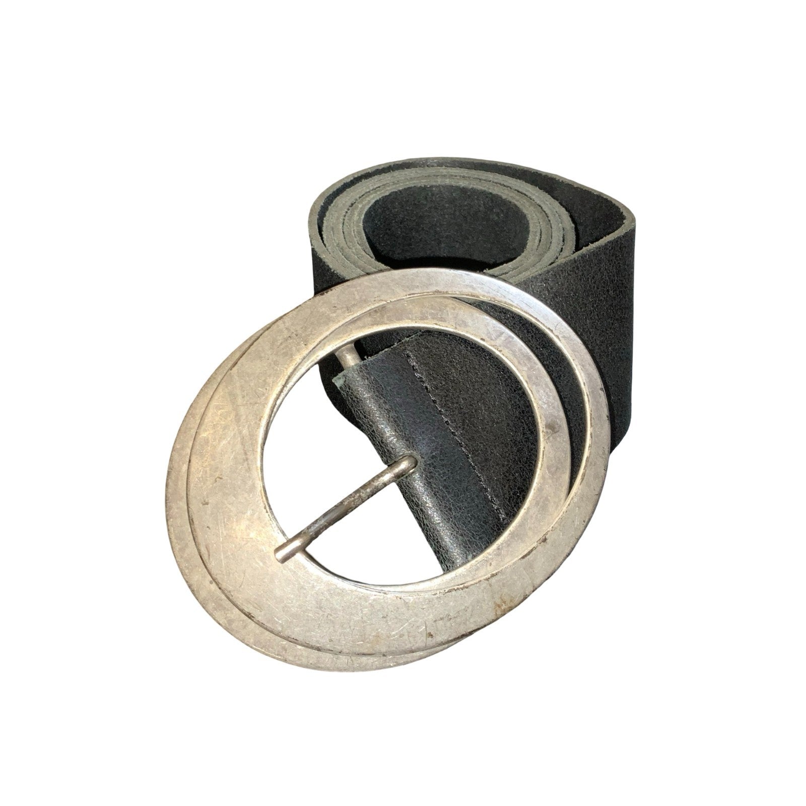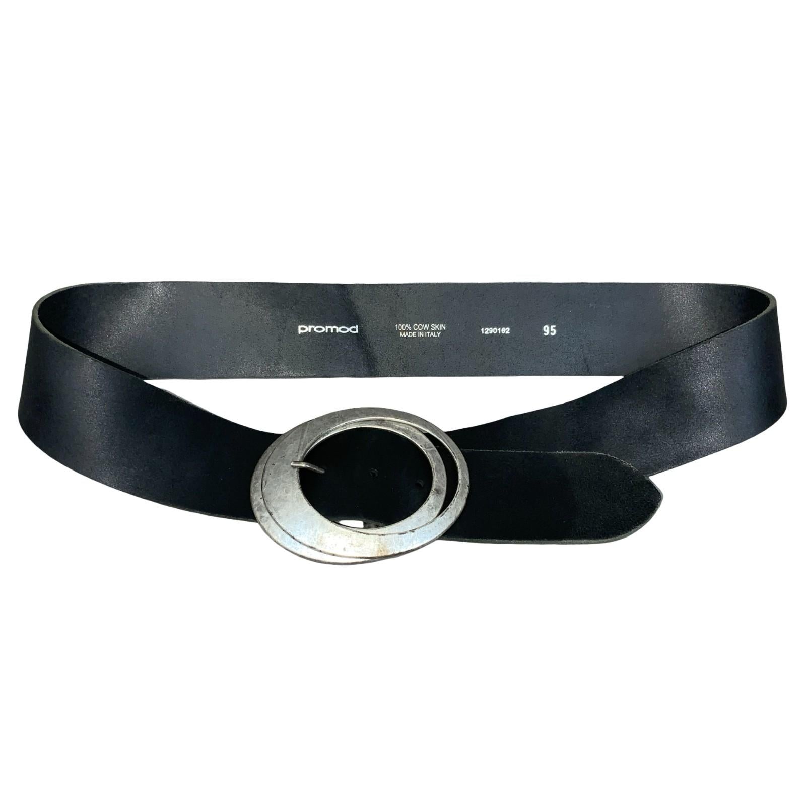 Vtg 90s 'Promod' Black Leather Oval Silver Metal Buckle Statement Belt Size L