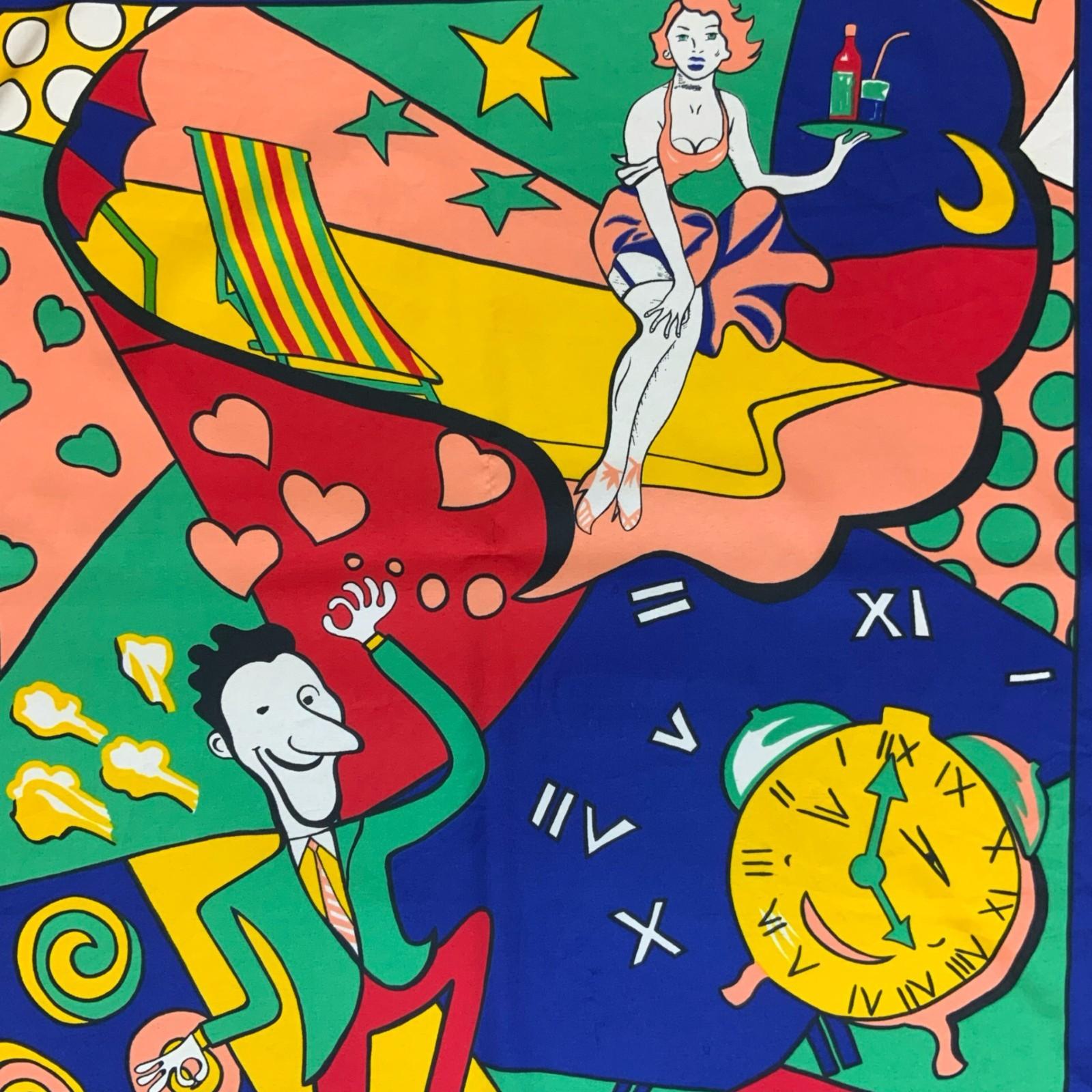Vintage 1990s square scarf with a colourful abstract design featuring a man, woman, and a clock in multiple colours. Made from 100% polyester in Italy.