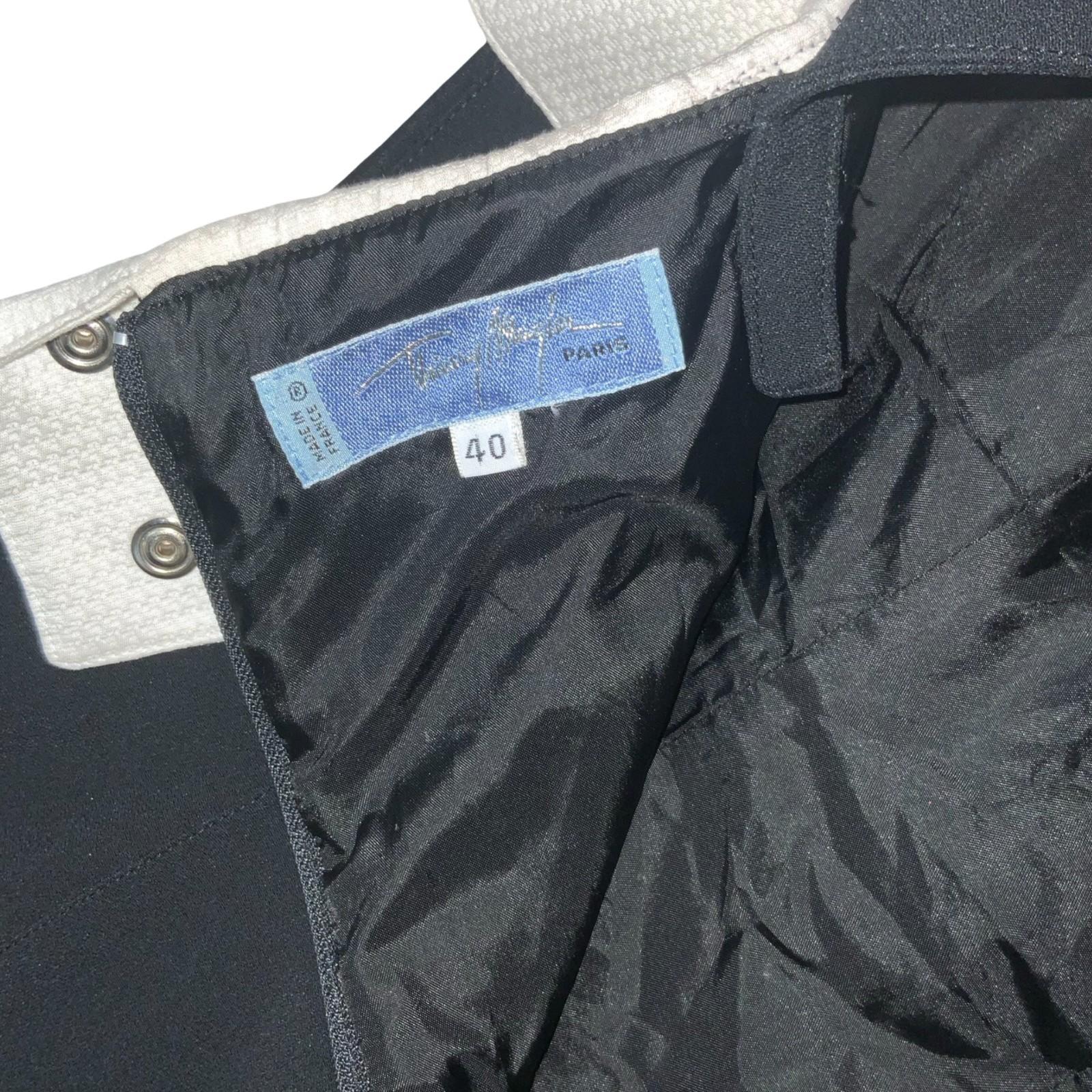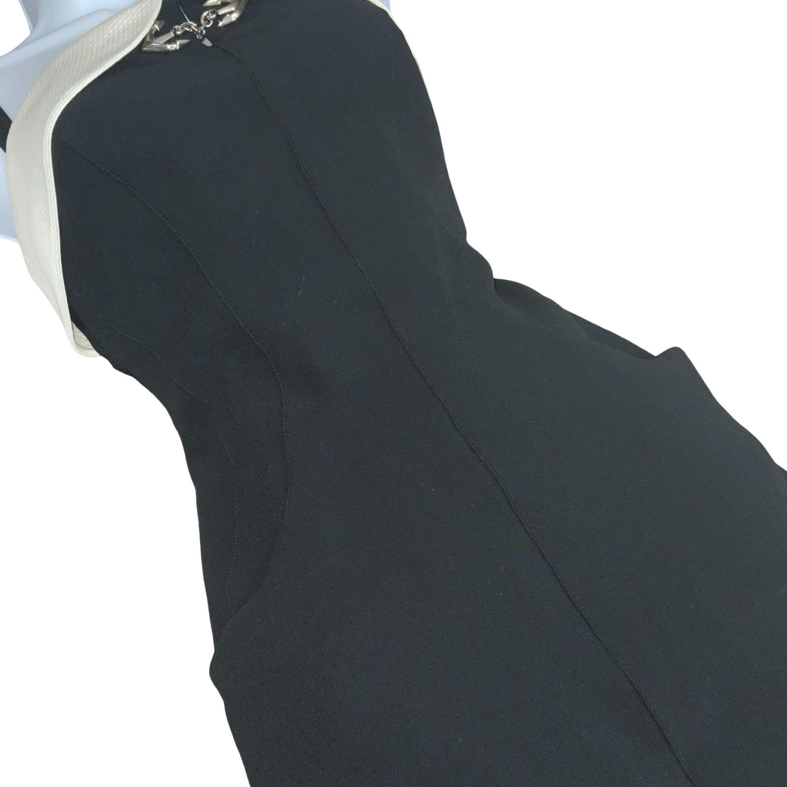 Vintage 1990s RARE Thierry Mugler dress . This is an exceptionally rare and striking dress with a sleeveless design, white sailor style collar, anchor metal detail at the front, back zip fastening and pockets. It is a stunning bodycon style dress with a 'winged' front design, a hallmark of Mugler's distinctive style.