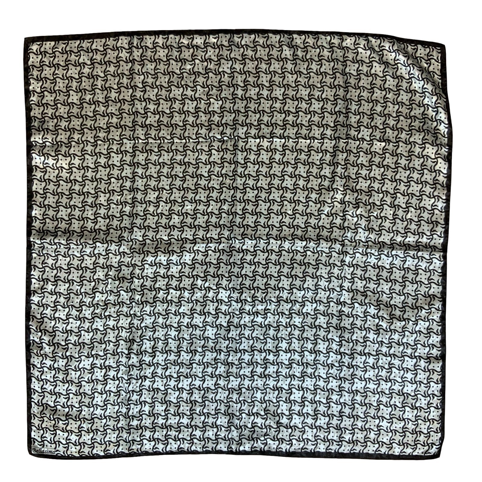 Vintage 1990s Bellasima grey, silver and black square scarf. This garment is a highly detailed piece with an overall houndstooth design laid over a subtle and intricate floral design in silver finished by a black border. It is a versatile item that can be worn as a scarf, hair piece, handbag accessory or even as a pocket square.