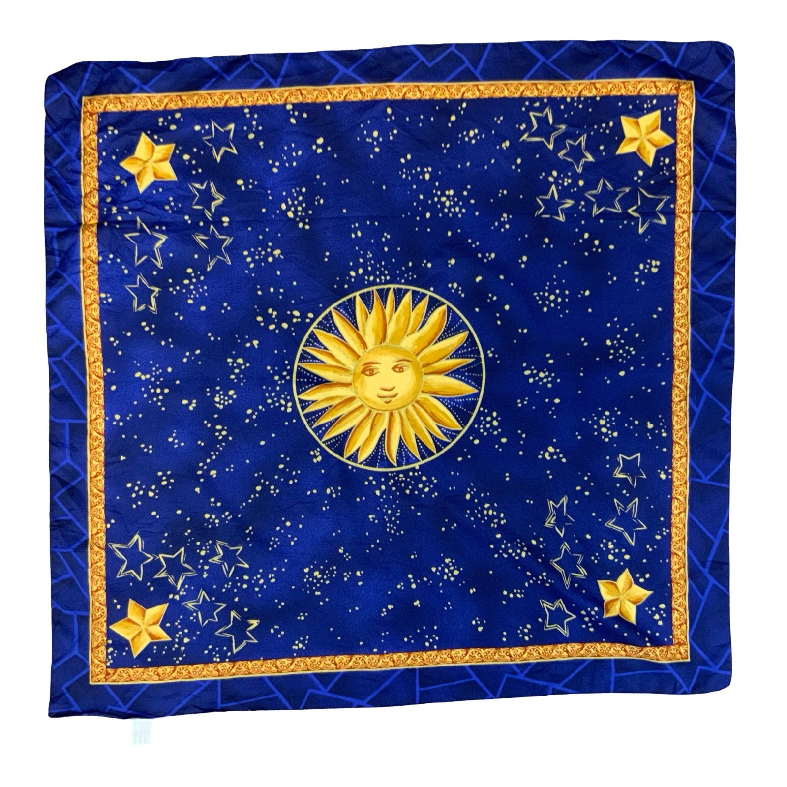 Vintage 1990s square scarf in blue and gold with an overall celestial themes pattern consisting of a central sun with a smiley face and other astrological themed designs. This can be used as an altar cloth, hair bandanna, scarf or handbag accessory - the possibilities are endless. Made from 100% polyester.