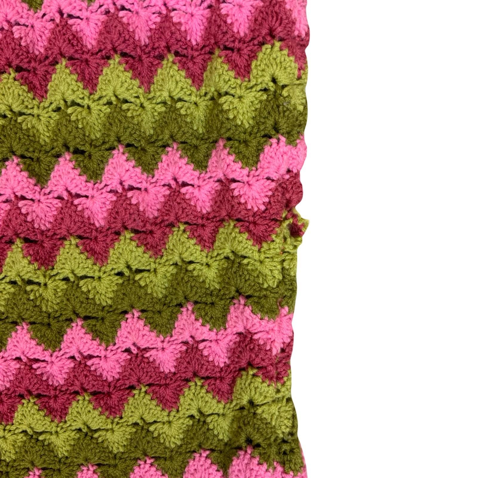 Vintage 1990s style sweater vest in a chevron style pattern using red, pink and two shades of green to create this design. It has a scooped neckline, thick strap sleeves, and an overall relaxed and boxy fit. We believe that this item is a handmade crochet sweater vest, with no mention of materials, but it feels like cotton and due to the style of pattern used there is some stretch.
