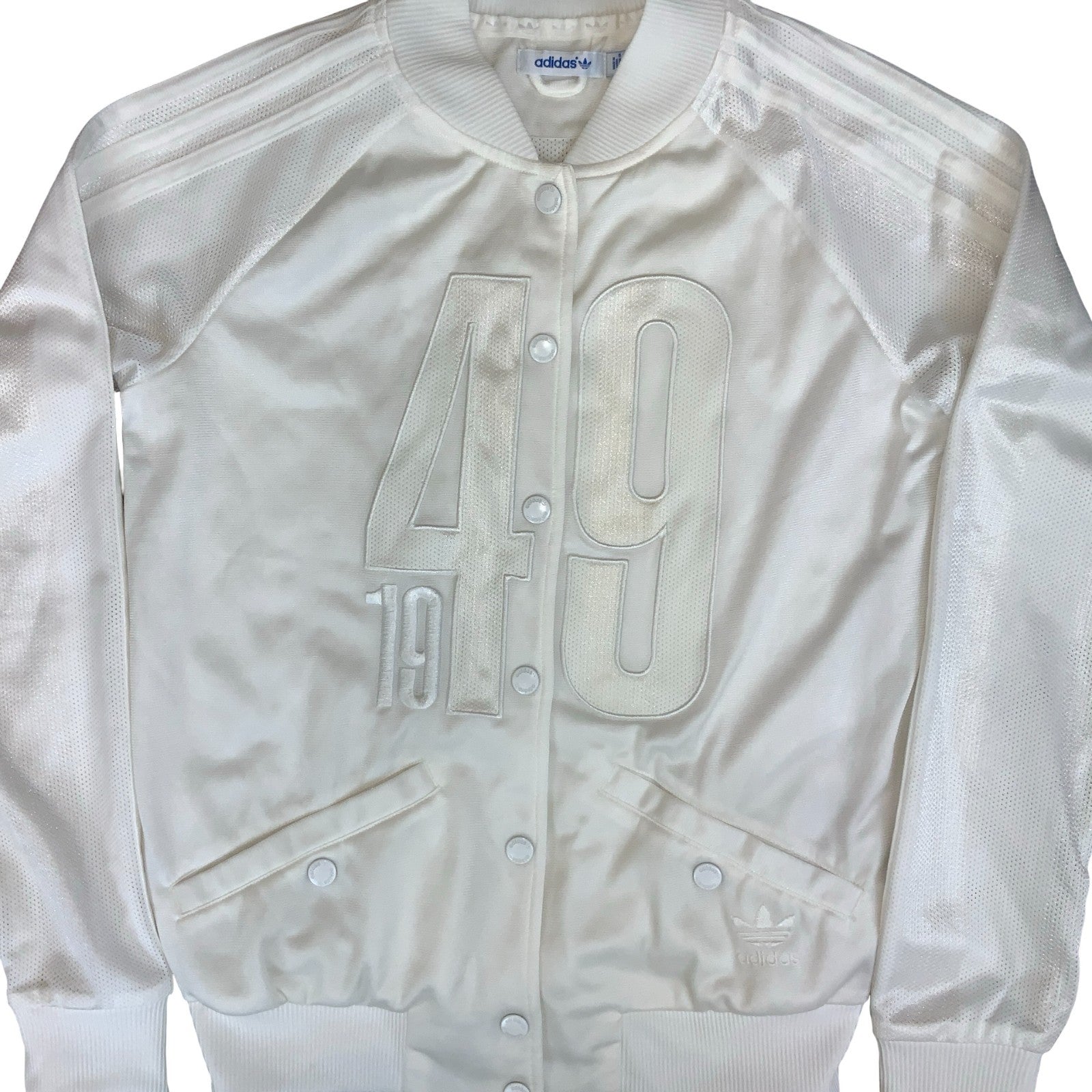 Vintage Adidas bomber style jacket in white with snap button fastening, ribbed collar, waistband and long sleeves with ribbed cuffs, and the numbers '19' and '49' embossed on the front. These numbers are characteristic elements referencing Adidas's founding year in 1949. Made from 100% polyester.