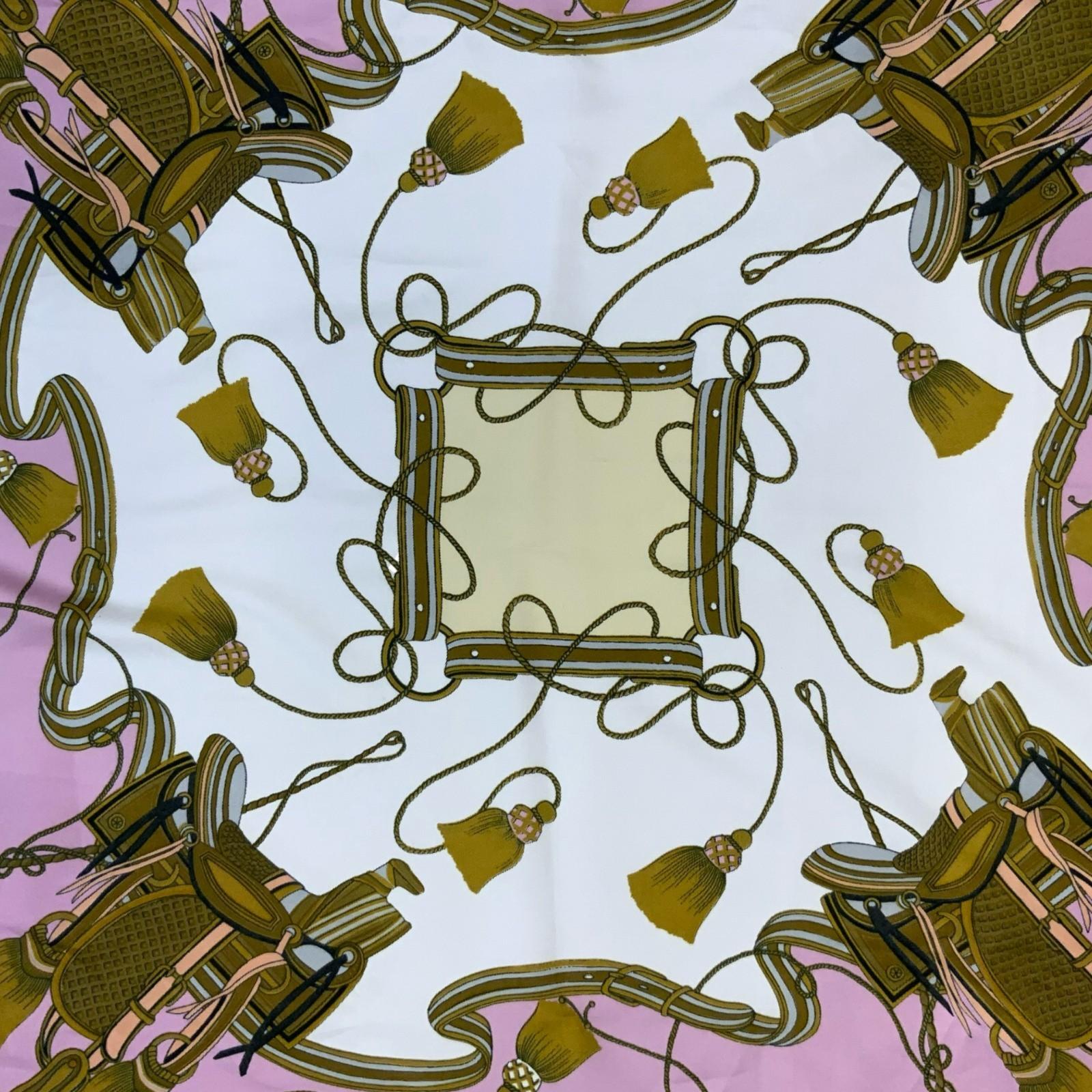 Vintage unique scarf featuring an equestrian themed style pattern in beige, brown and pink including horse-riding related decorative elements. Made in Italy using 100% polyester. It is soft, lightweight and large which makes it incredibly versatile as a neckerchief, bandanna, bag accessory, tied up as a top, tied to a belt loop or used as a belt.