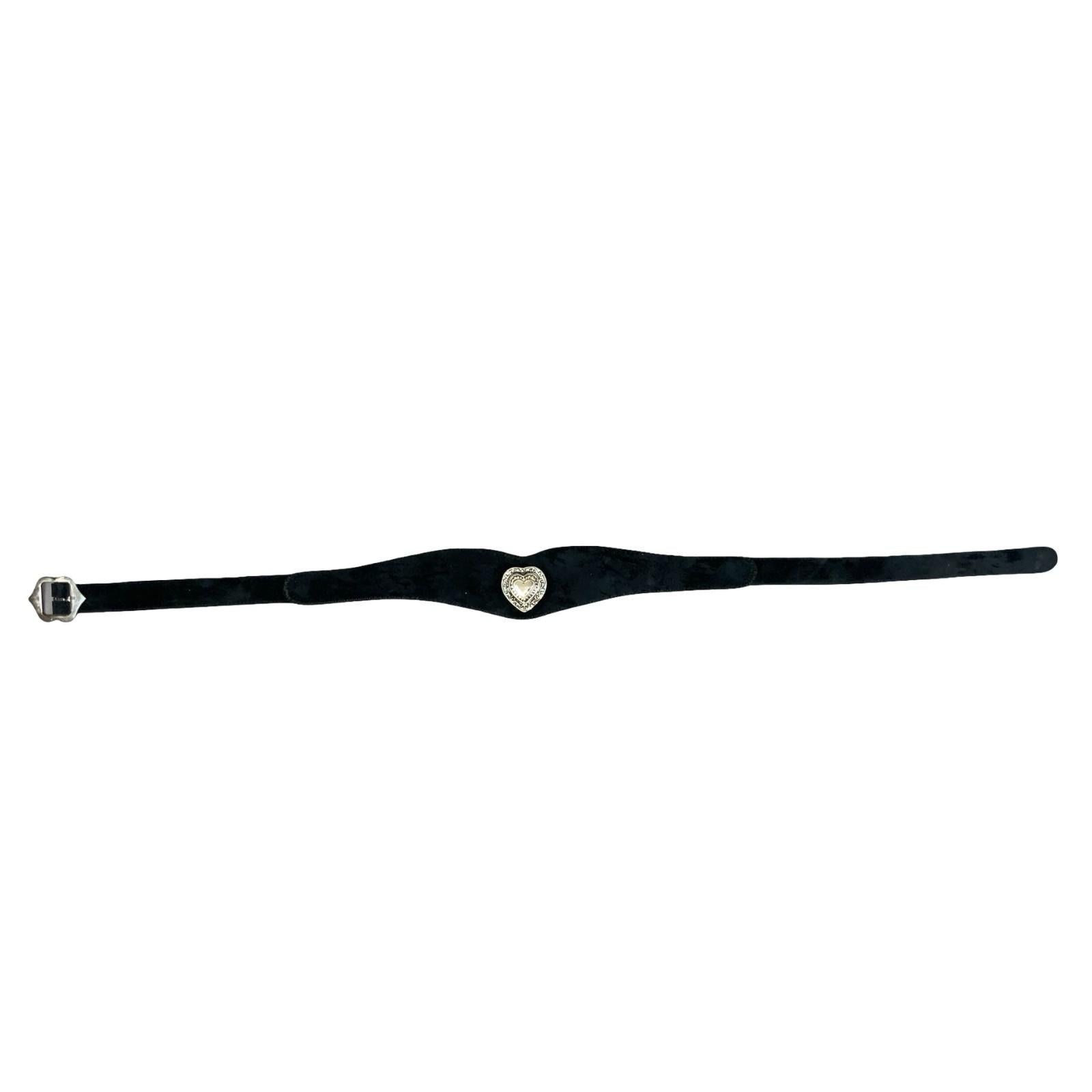 Vintage Austrian folk under-bust belt in black. Textured leather with intricate silver heart stud detail and a buckle fastening with 5 prong hole options for sizing.