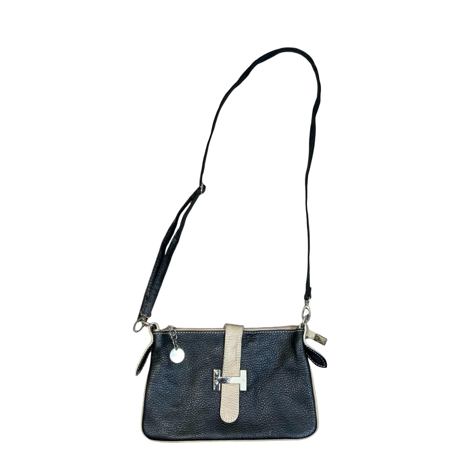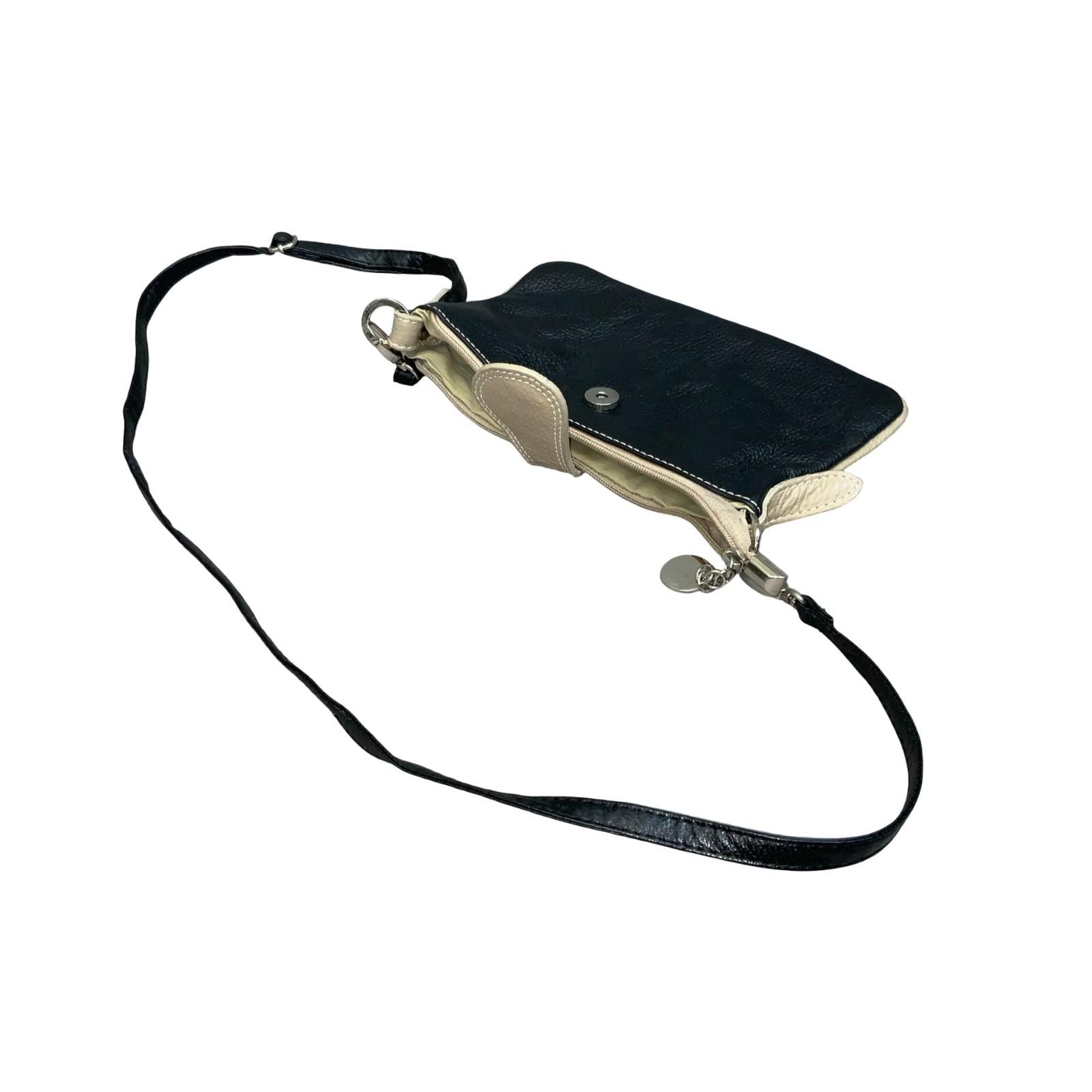 Vintage crossbody leather purse with a detachable strap in very good condition. Fabric lining, silver-tone hardware and a circular bag charm. Predominantly black with beige details, zip closure and leather strip flaps with magnetic closure. Interior zip pocket.
