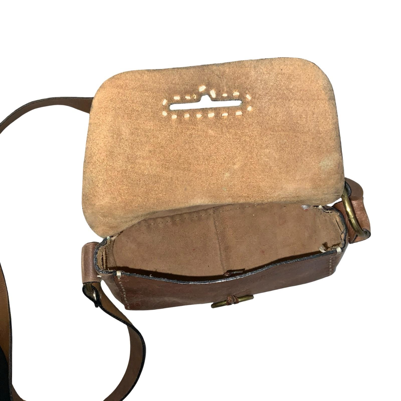 Vintage brown leather crossbody style bag with a flap closure and prominent gold ring detail. It has a long shoulder strap, one main bag section, and visible light brown stitching over the brown leather of the bag. It is a small-medium sized bag which will definitely fit your phone, wallet, keys, etc.