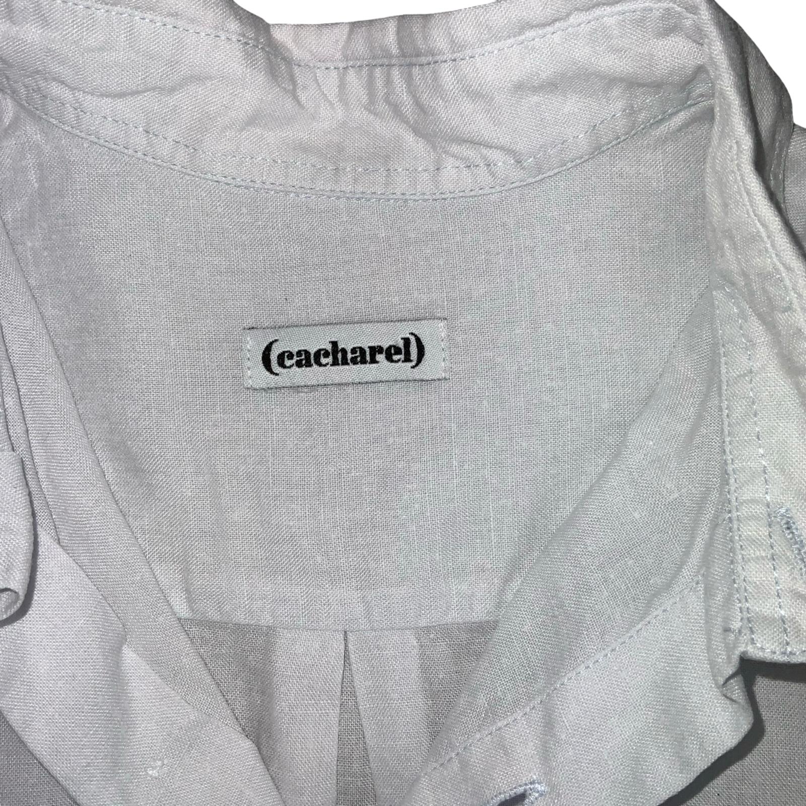 Vintage Cacharel button-up shirt in an off white colour, almost lilac in some lighting, and pale blue stitching. It has short sleeves, collared neckline and a single chest pocket. No mention of materials but feels soft and lightweight, would suggest cotton.