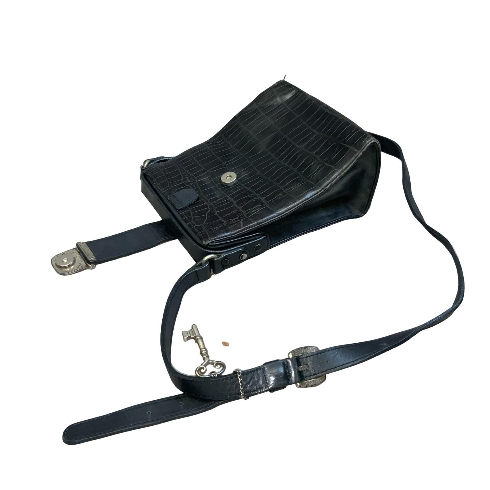 Vintage black, crocodile-embossed crossbody bag from Fossil. Handmade from the finest top grain leather available. Featuring an adjustable crossbody strap, one main pouch with an internal zipped pocket and a doctor bag style closure with a magnetic flap over snap button closure. Excellent vintage condition, it still has its Fossil branded key bag charm attached.