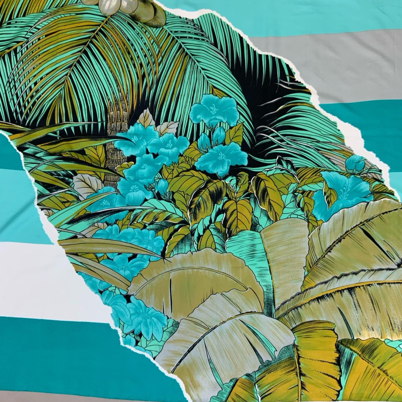 Vintage large Franco Laurenti shawl featuring a vibrant tropical palm leaves and striped pattern in shades of blue. This elegant shawl can also be worn as a scarf, head scarf, wall handing, table runner, sarong or sofa throw. Made in Italy with no mention of materials but feels soft, lightweight and smooth which is consistent with silk or silk blend.