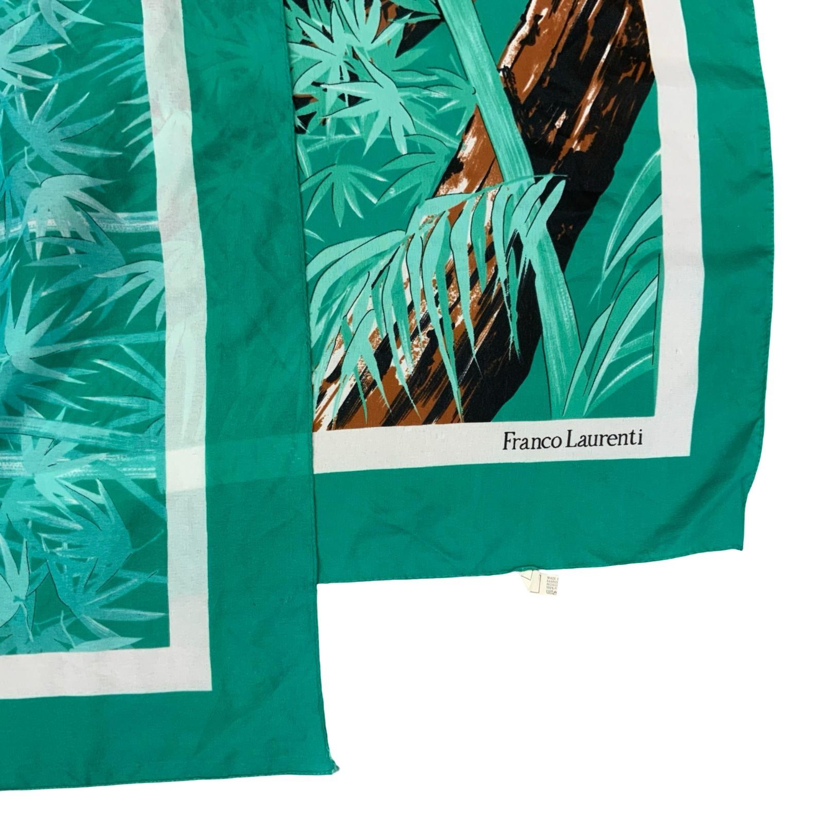Gorgeous vintage Franco Laurenti large scarf with a leopard themed graphic print on a teal green background. It is thin and lightweight, slightly sheer and perfect for travel. It is large enough to be a beach cover-up, shawl, scarf, blanket or wall hanging. Made in Italy with 100% polyester.