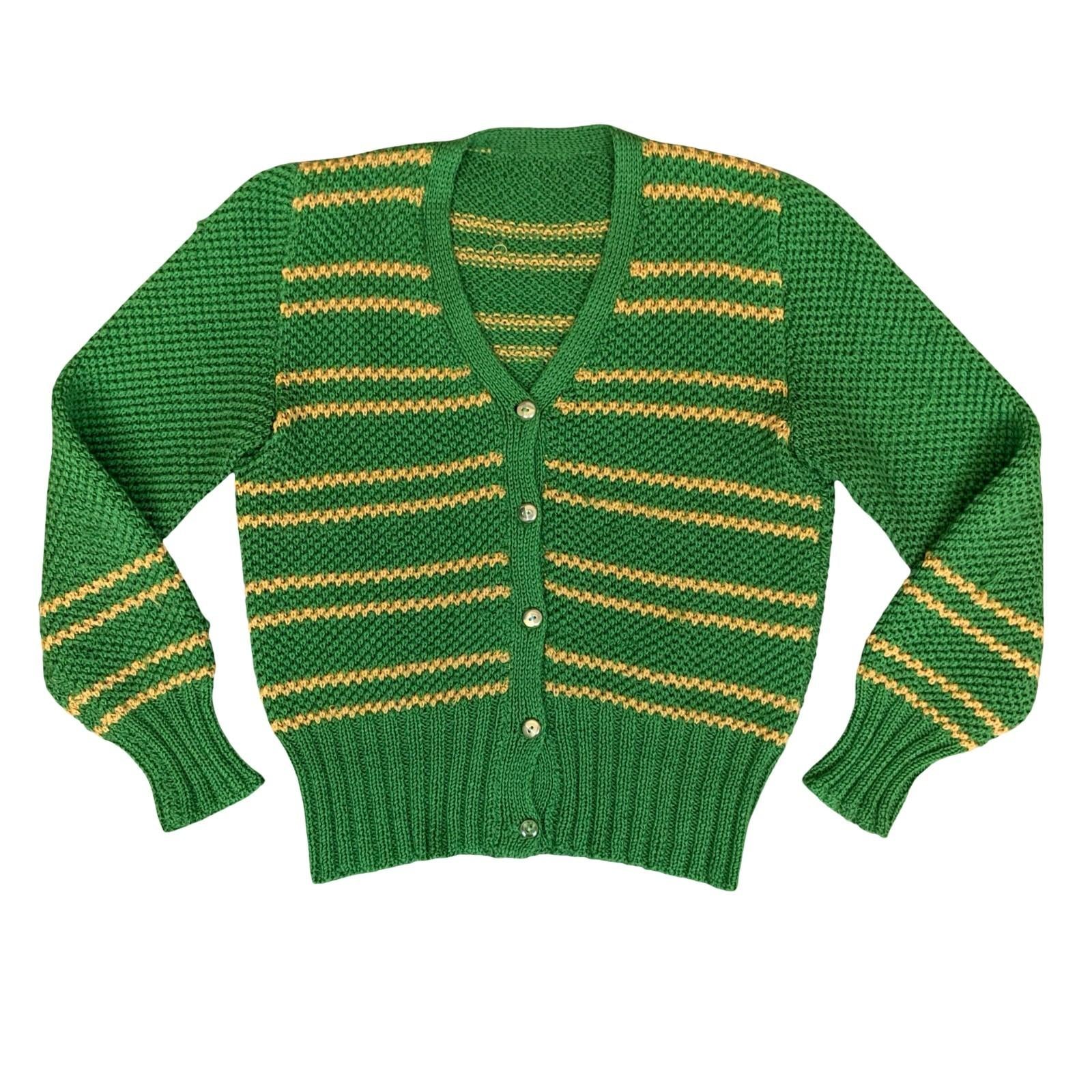 Vintage 1980s/90s green knit cardigan with yellow striped, v-neckline, long sleeves and a button up fastening. There are no labels - and so no mention of materials but feels like cotton. Soft, lightweight, and casual in style. Pair this with the right combination and it can be perfect for all year round use.