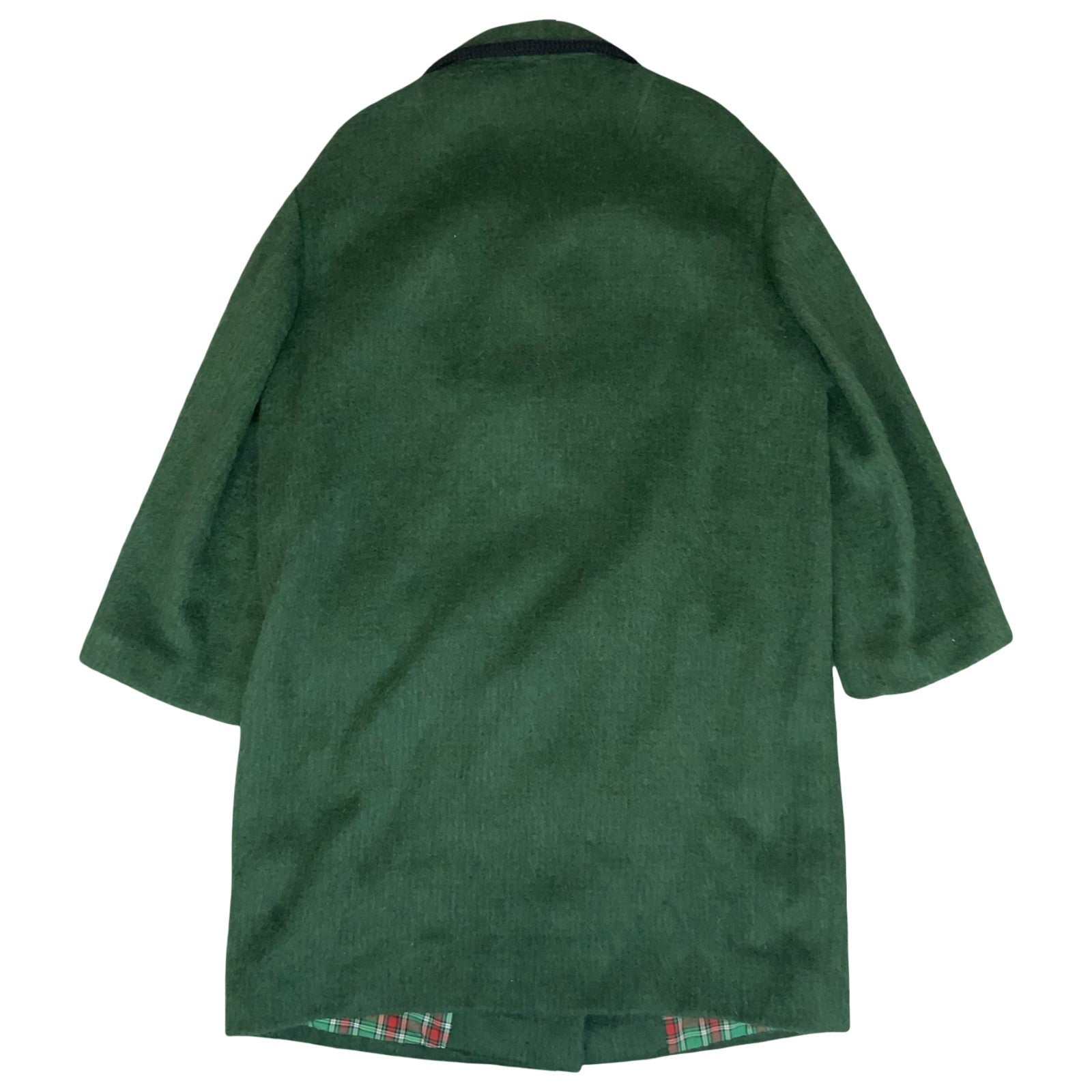 Vintage Hock München branded wool coat in green with a plaid internal lining. The coat features a front button fastening with large statement cold buttons, a notched lapel neckline, two external pockets with a black contrasting hem which is again repeated around the collar. Hock München is a traditional German brand known for their traditional Bavarian attire. Excellent vintage condition.