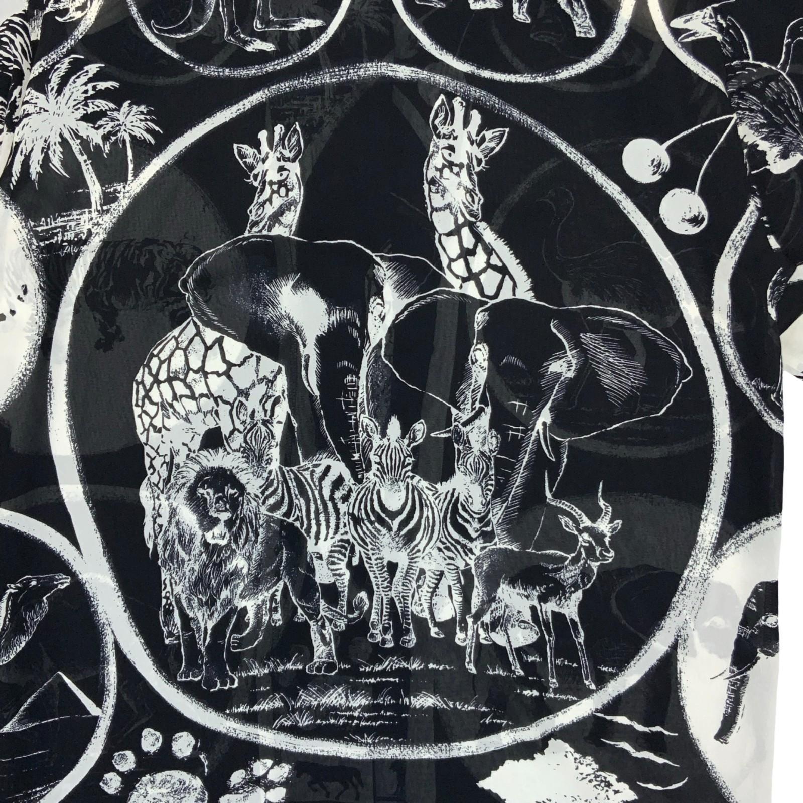 Vintage button up blouse by Kana in black with white graphic animal related images featuring giraffes, elephants, ostrich and other animals. It has a button up fastening, collared neckline, a loose fitting and shoulder pads. No mention of materials but it is lightweight and slightly see-through, we would suggest a polyester blend.
