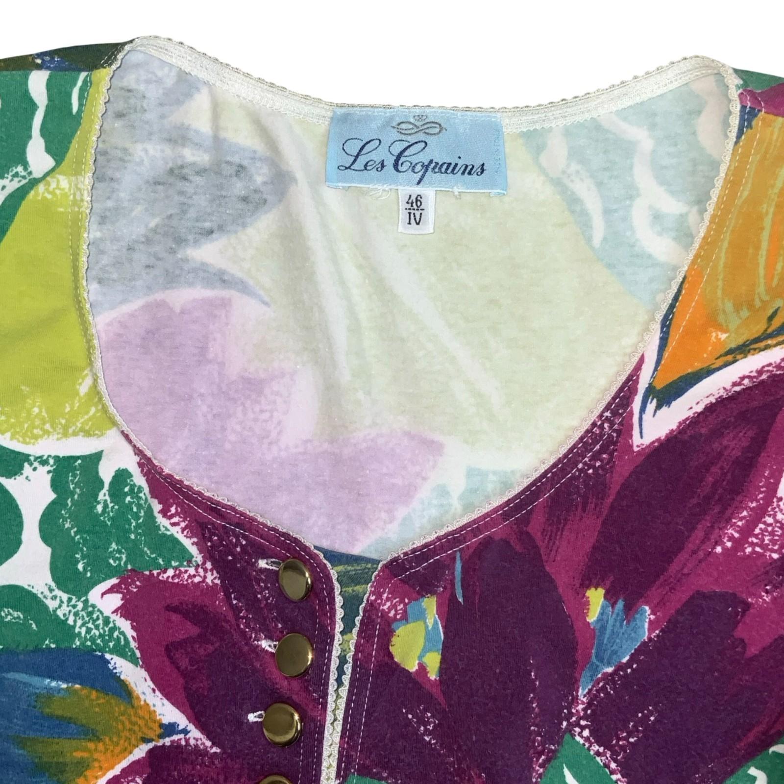 Vintage Les Copains figure-hugging minidress in a floral design featuring blues, greens, pinks and yellows. It has a scoop neckline with lace detail with 6 gold buttons, short sleeves, and a figure-hugging style made from a soft, stretchy and lightweight material. No mention of materials on any label but based on the feel we strongly suggest it is a polyester and cotton blend.