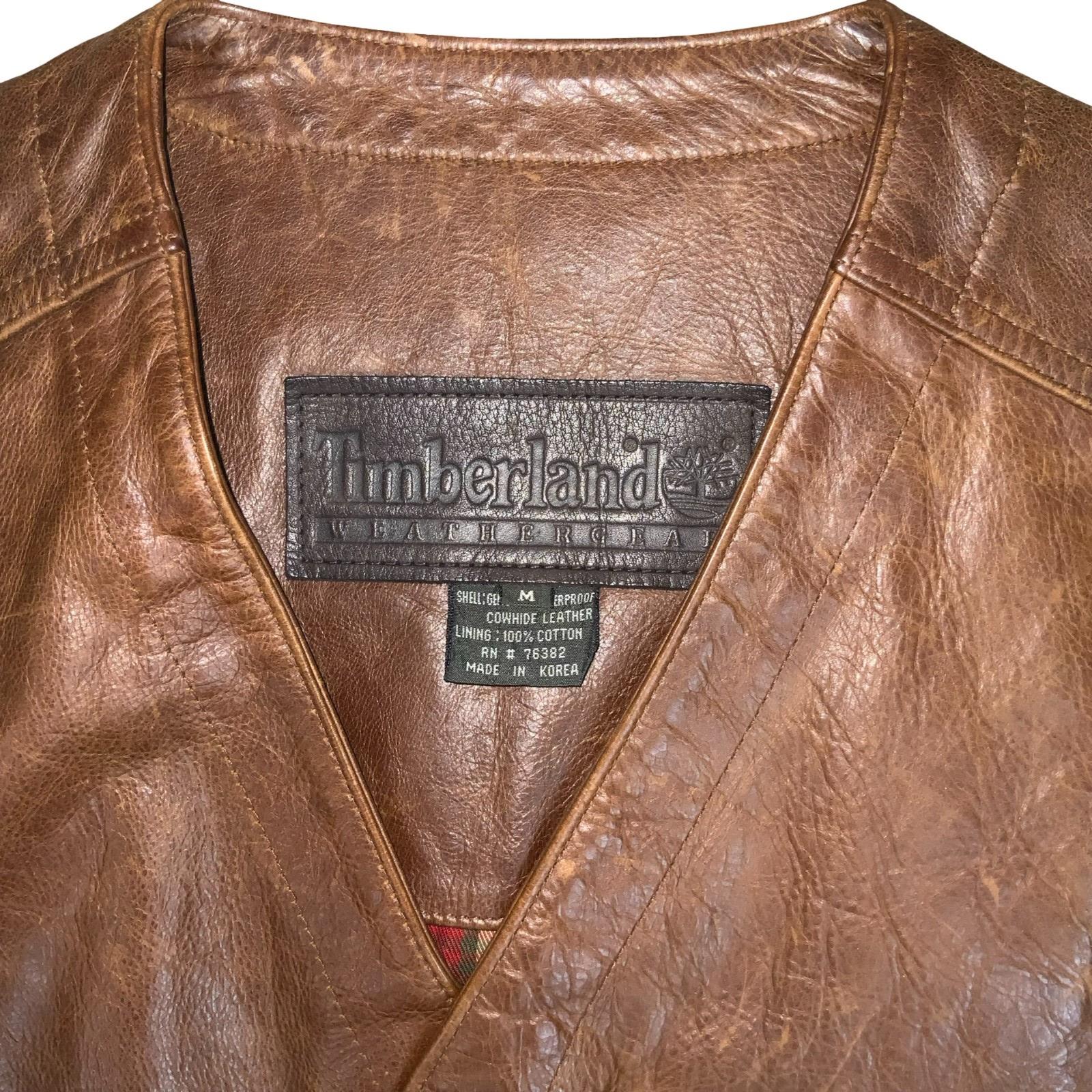 Vintage Timberland weather-gear leather utility waistcoat in brown with a flannel internal lining. Overall there are 3 pockets and it is fastened with 4 snap buttons. Made from 100% waterproof cowhide leather with the lining 100% cotton. Excellent vintage condition.