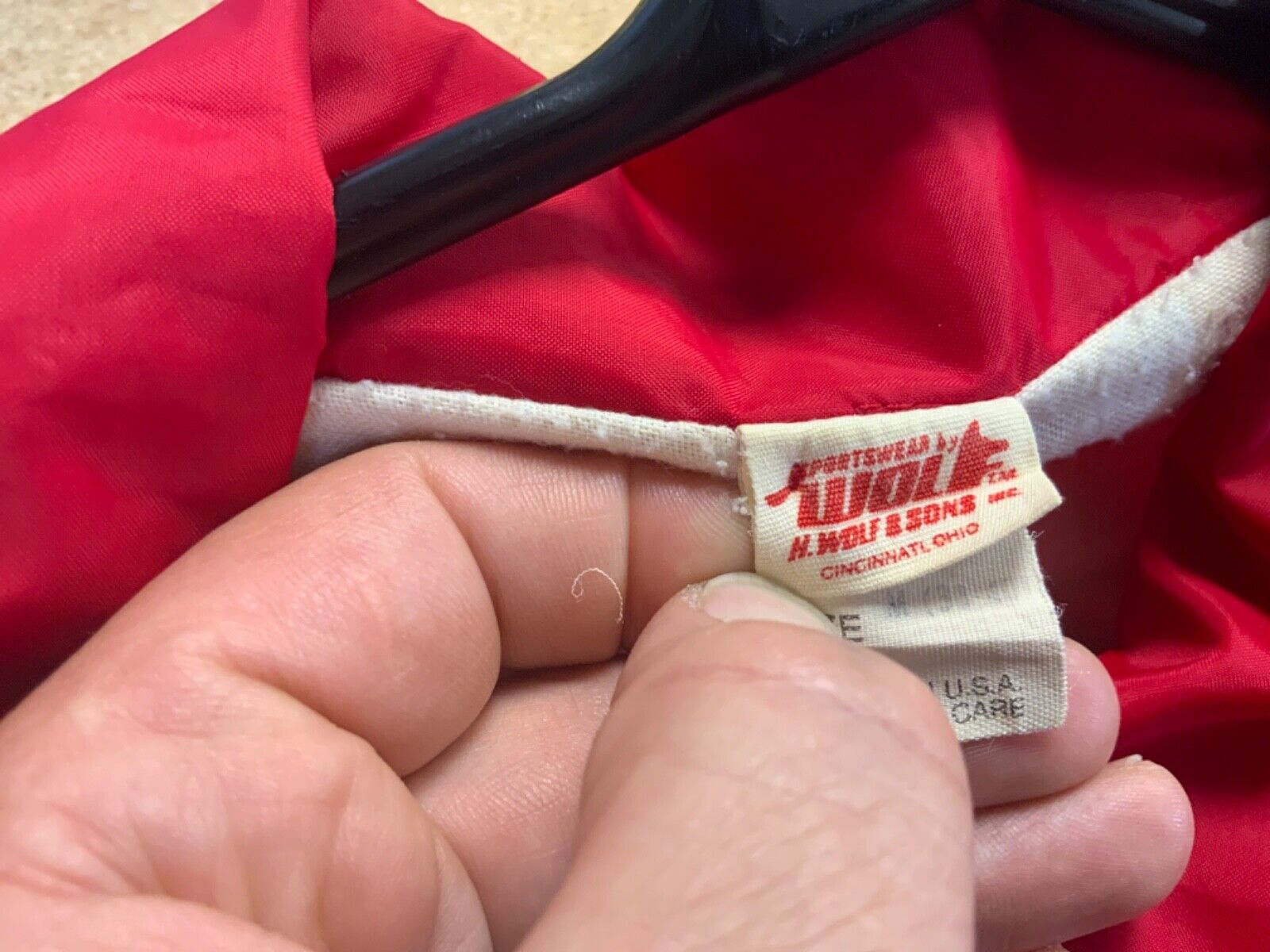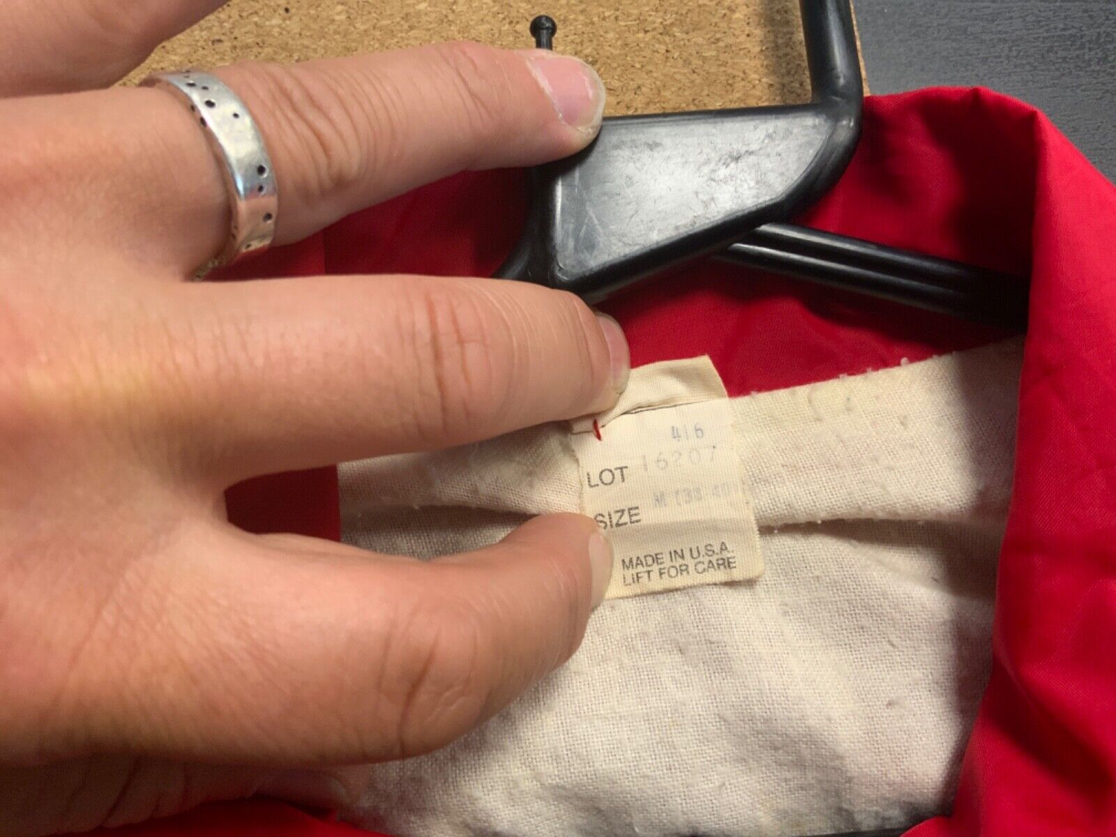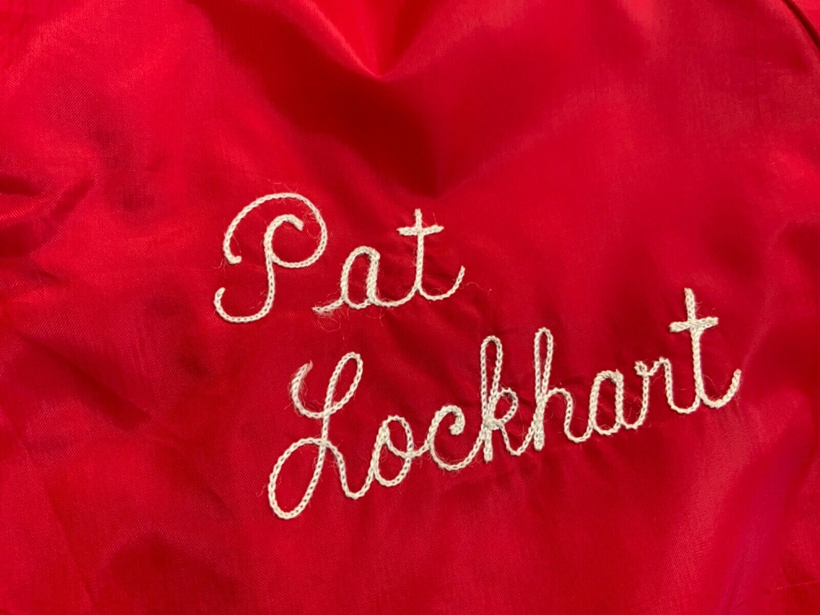 Here we have a vintage USA made Wolf & sons Ohio brand lined nylon windbreaker jacket with the “Piner fiskburg ladies aux Fire department appliqué logo on the back and the name “Pat Lockhart” chain stitch embroidered in the front