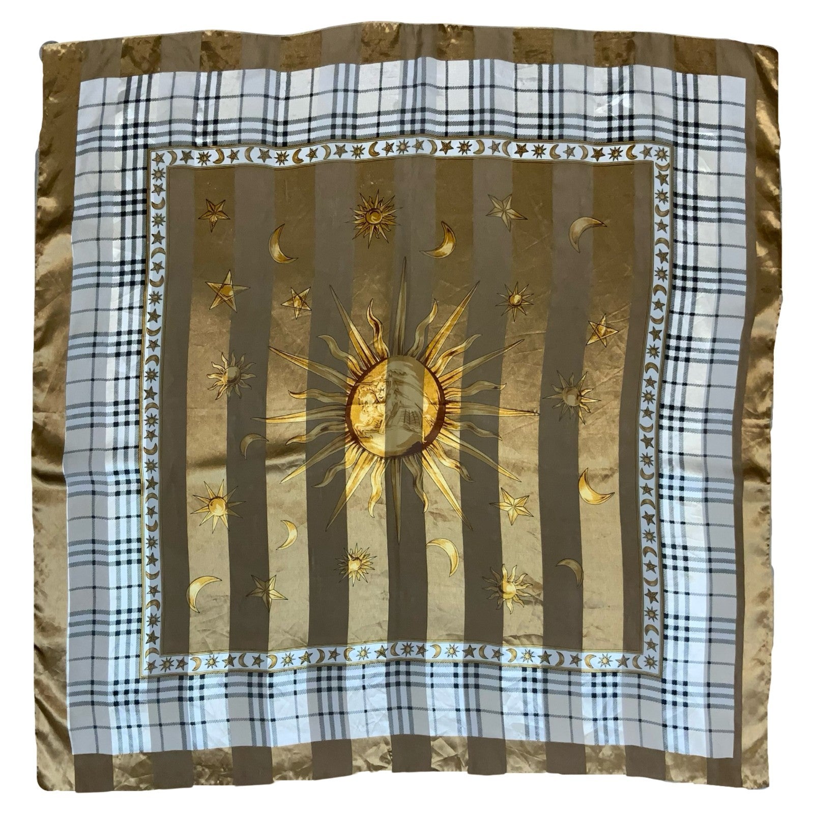 Vintage 2000s y2k celestial themed hippie square scarf in gold, brown, black and white with a central sun motif surrounded by scattered suns and moons and finally bordered by a black and white tartan Burberry like pattern. Versatile piece that can be worn as a neckerchief, bandanna, handbag accessory or even as a top! No mention of materials but feels lightweight and soft - possibly polyester.