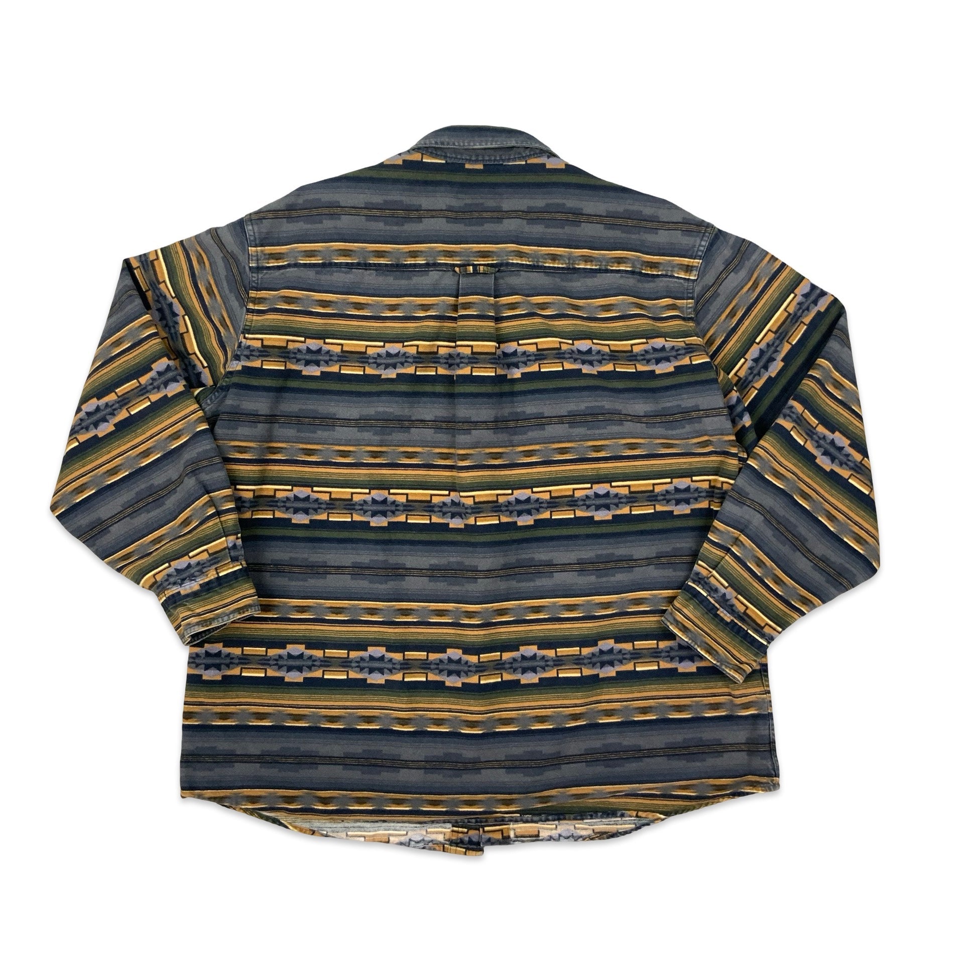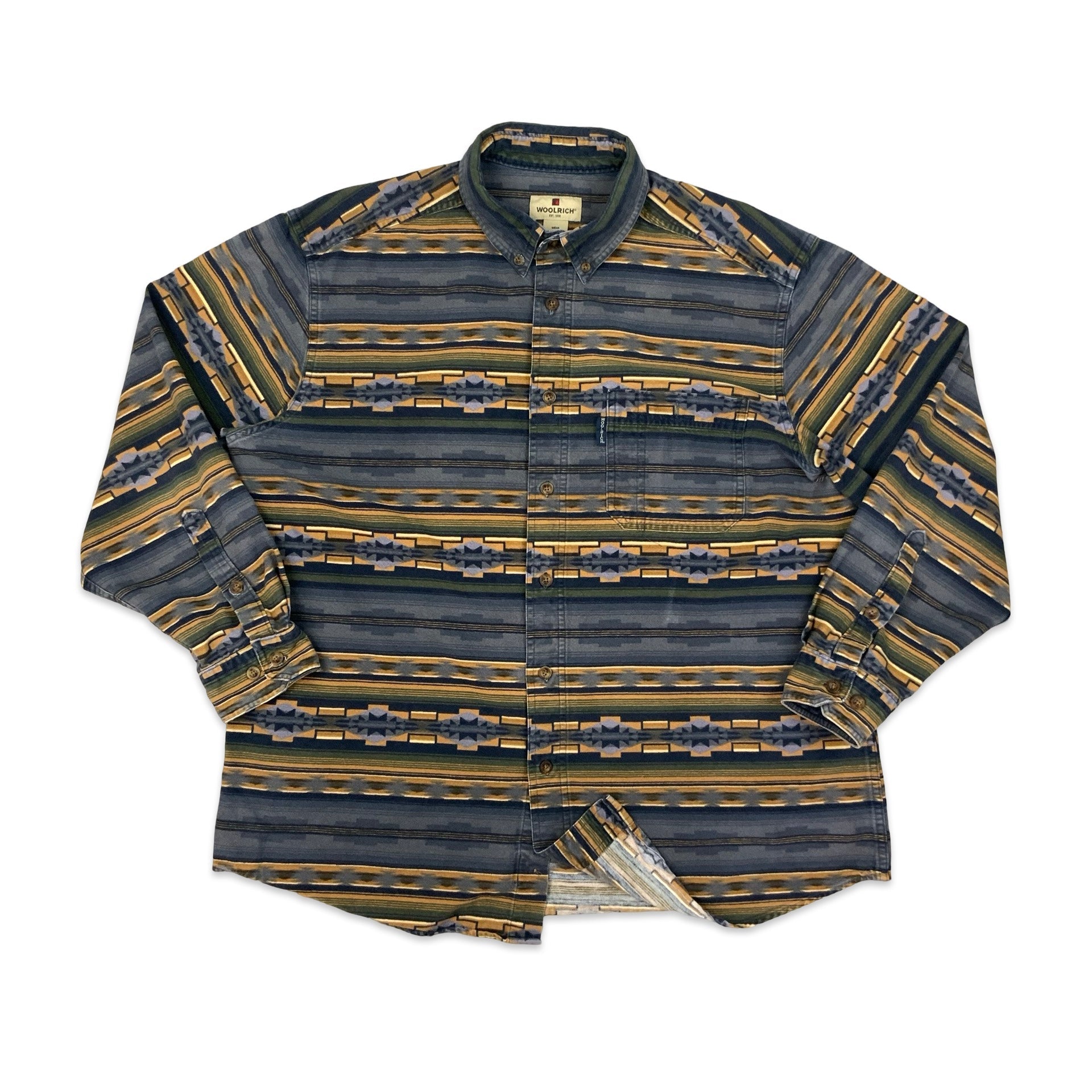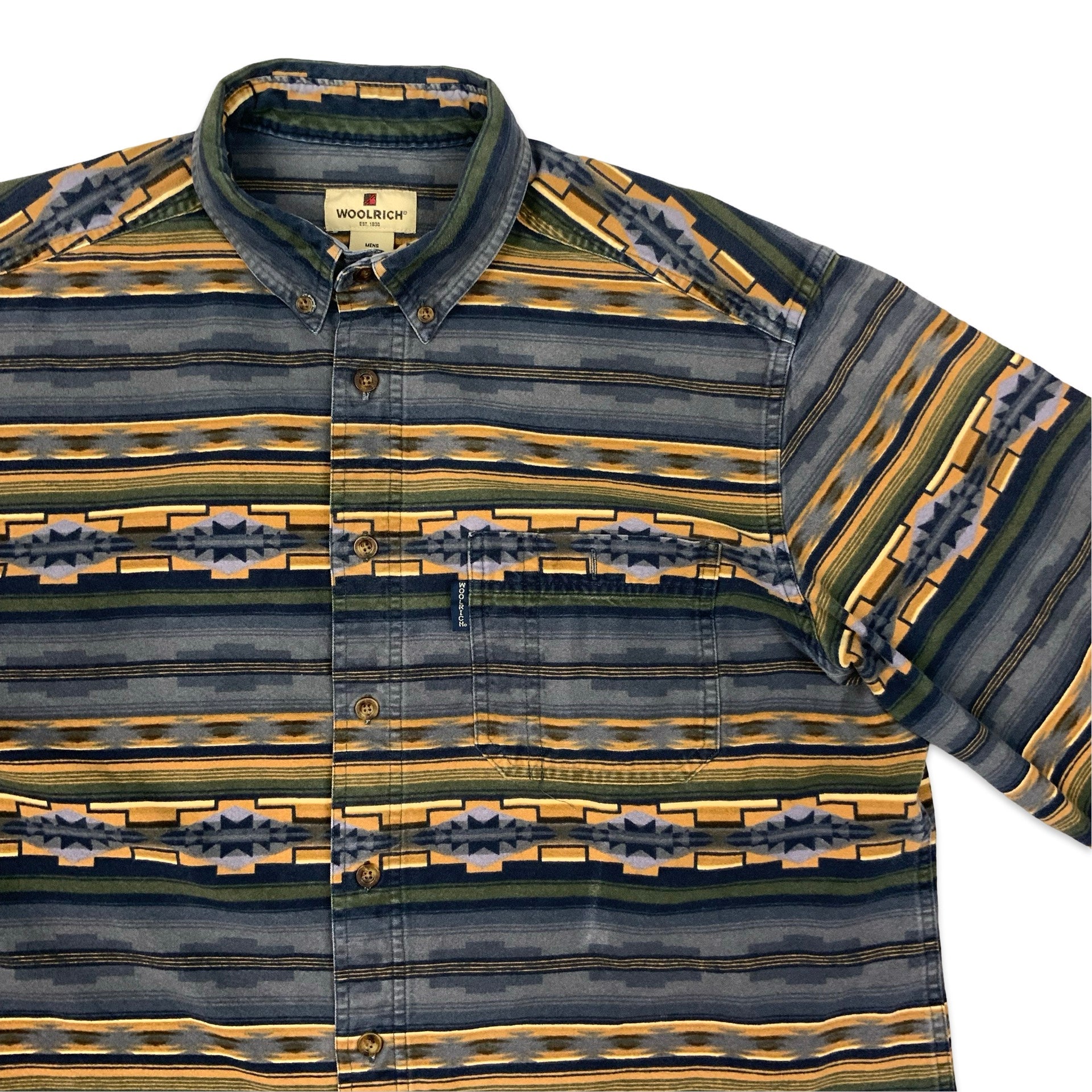 Preloved Woolrich moleskin Aztec print button-up shirt in orange and purple.