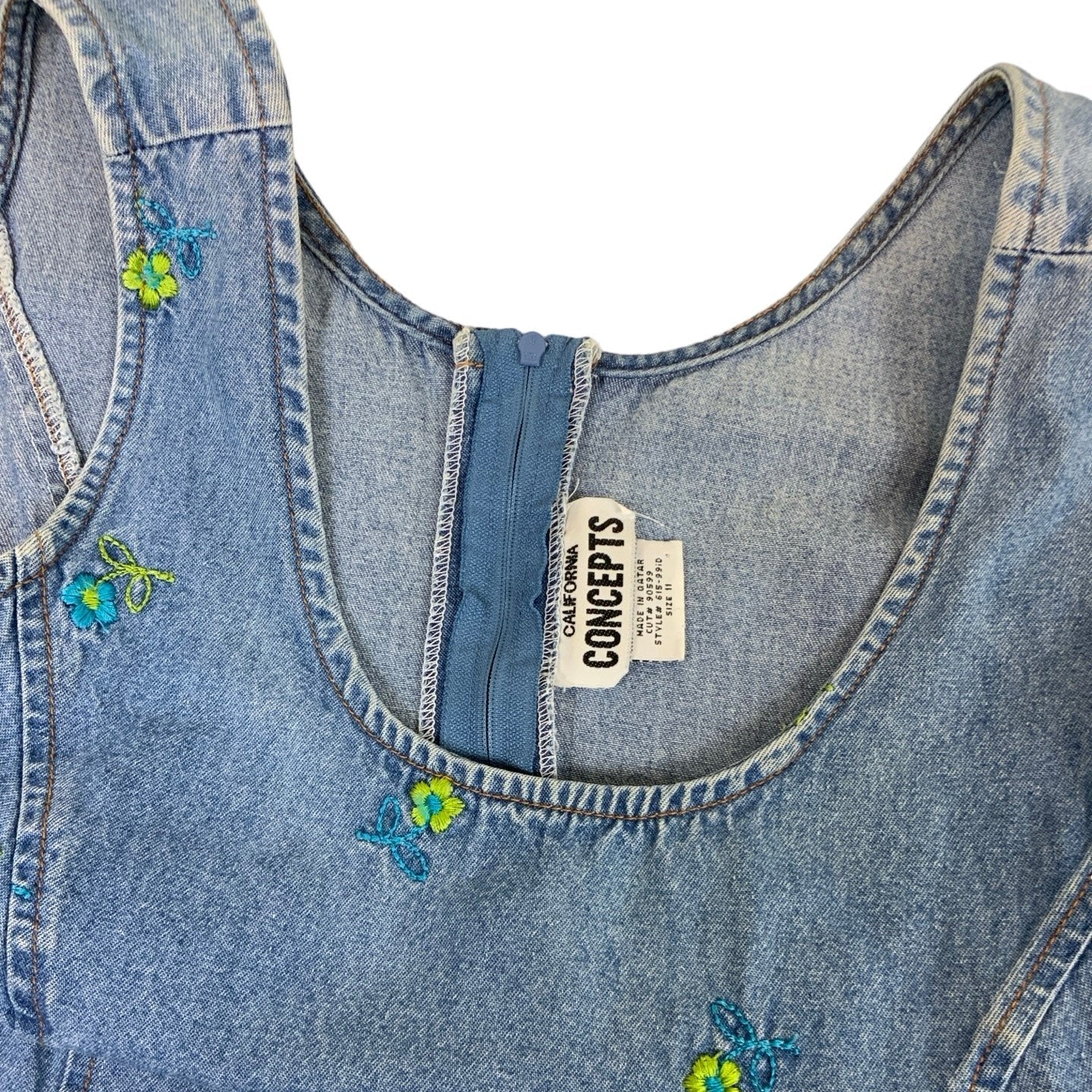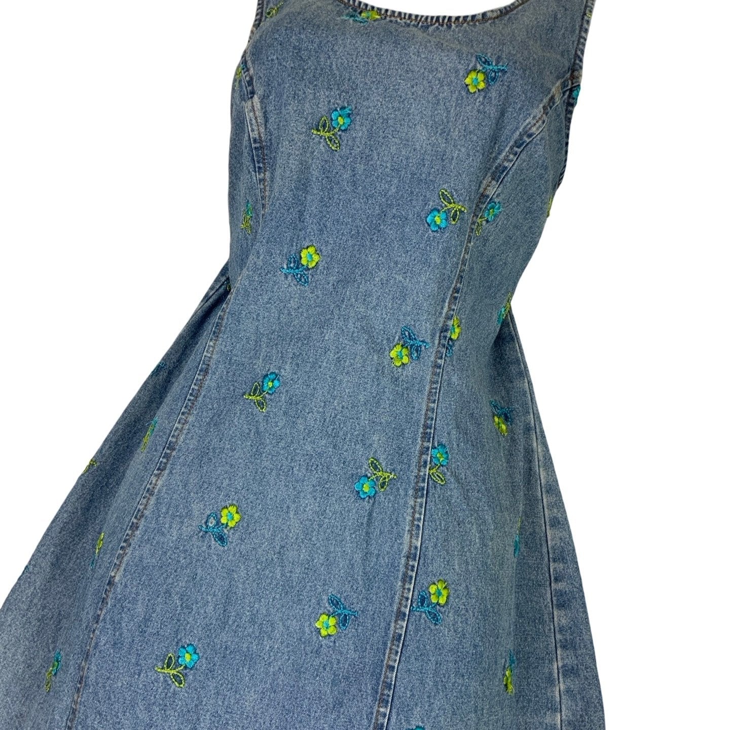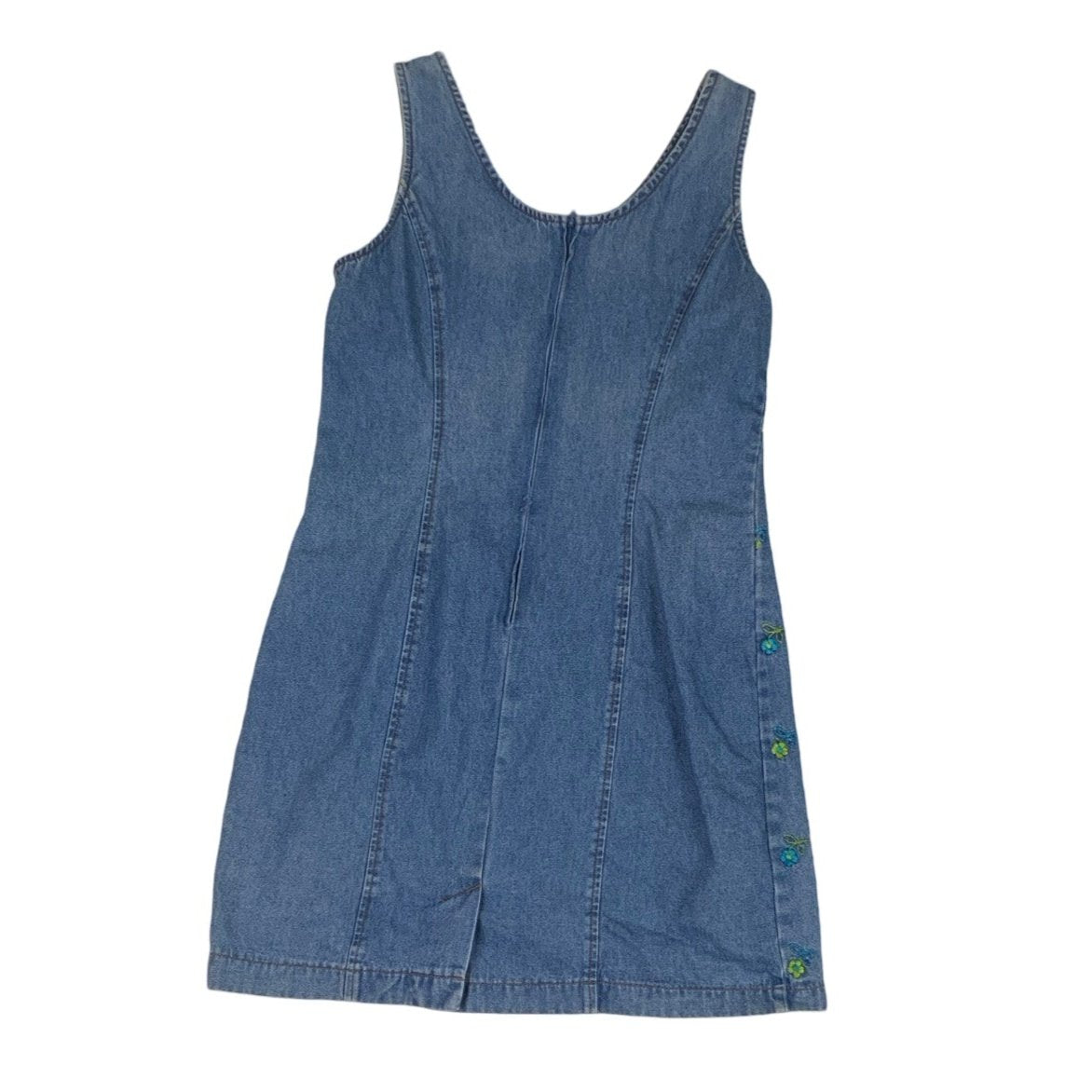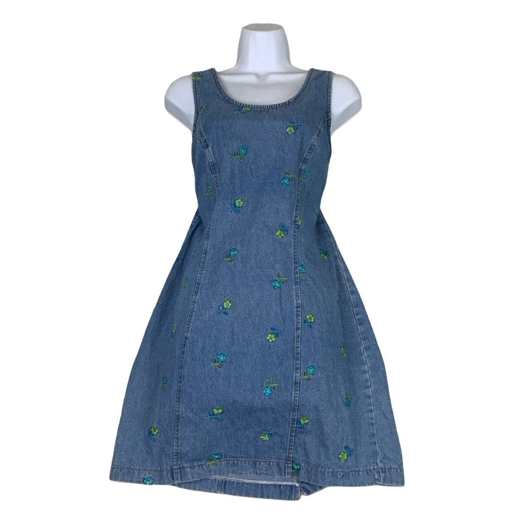 Vintage light blue denim sleeveless dress with green and blue embroidered flowers on the front, and a zip fastening at the back. 100% cotton.