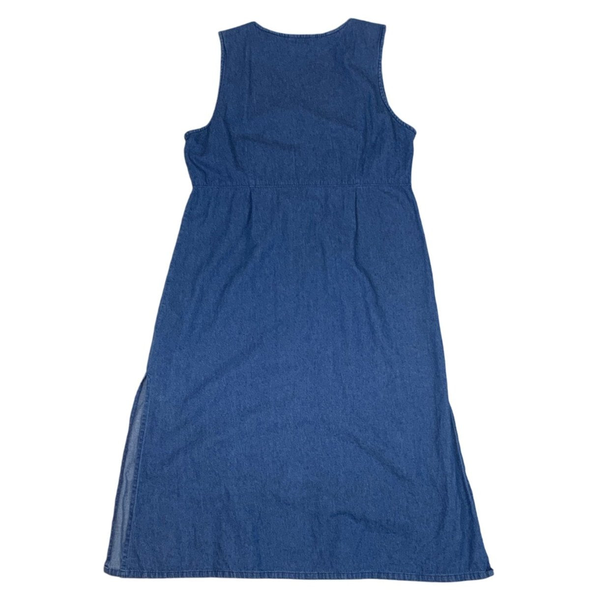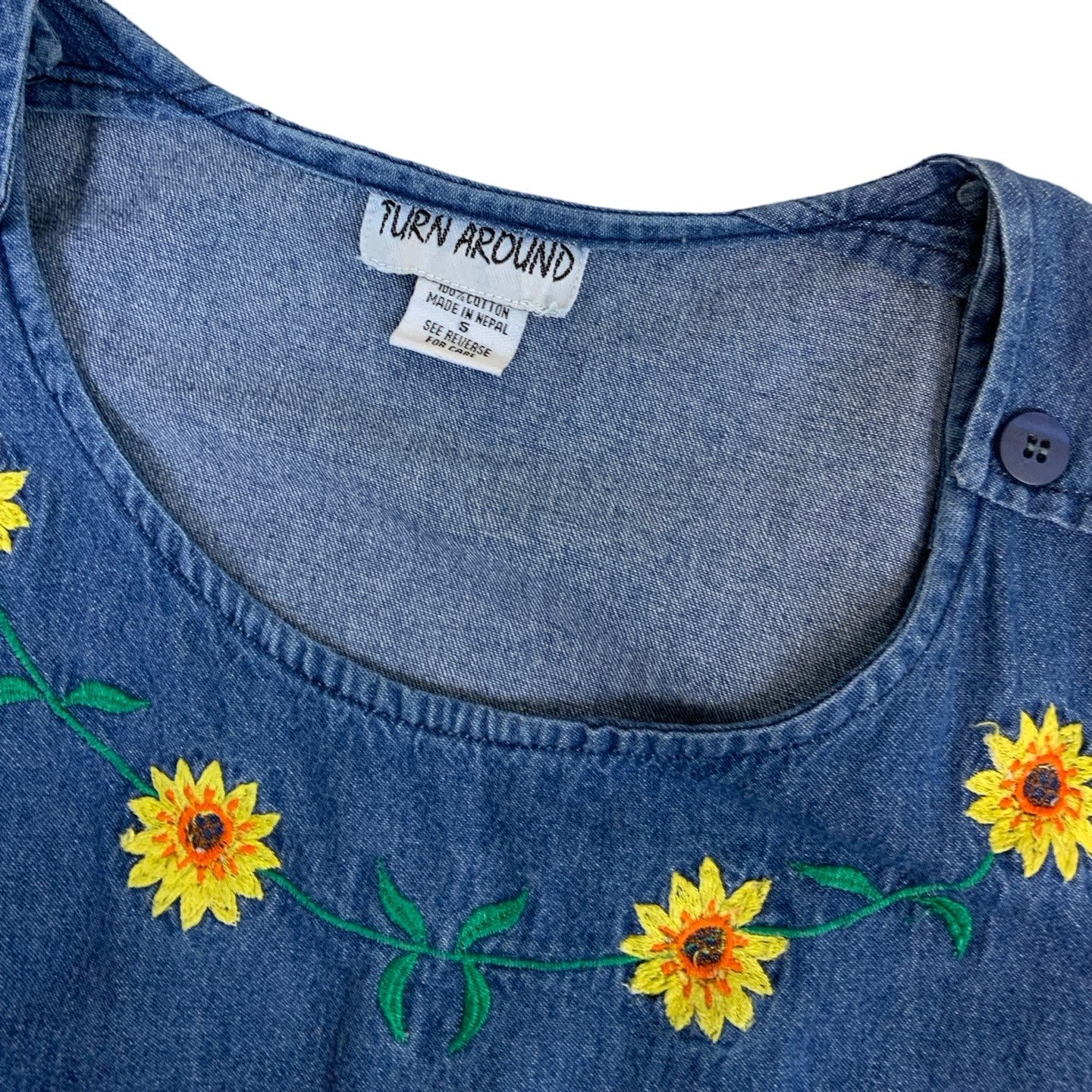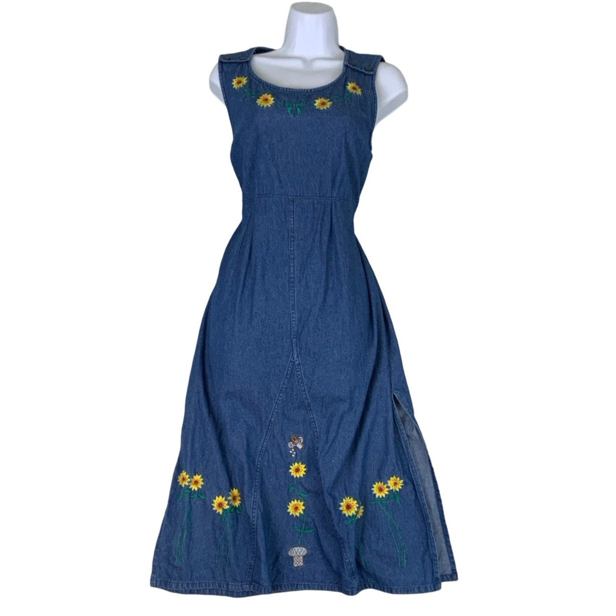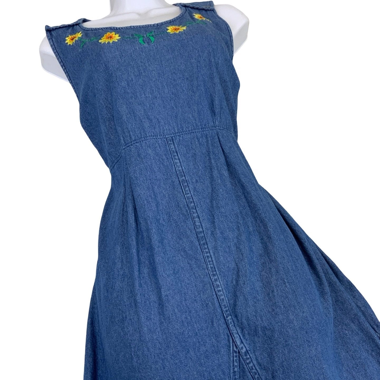 Vintage blue denim sleeveless midi dress with sunflower embroidery on the scooped neckline and again on the bottom hem. 100% cotton.